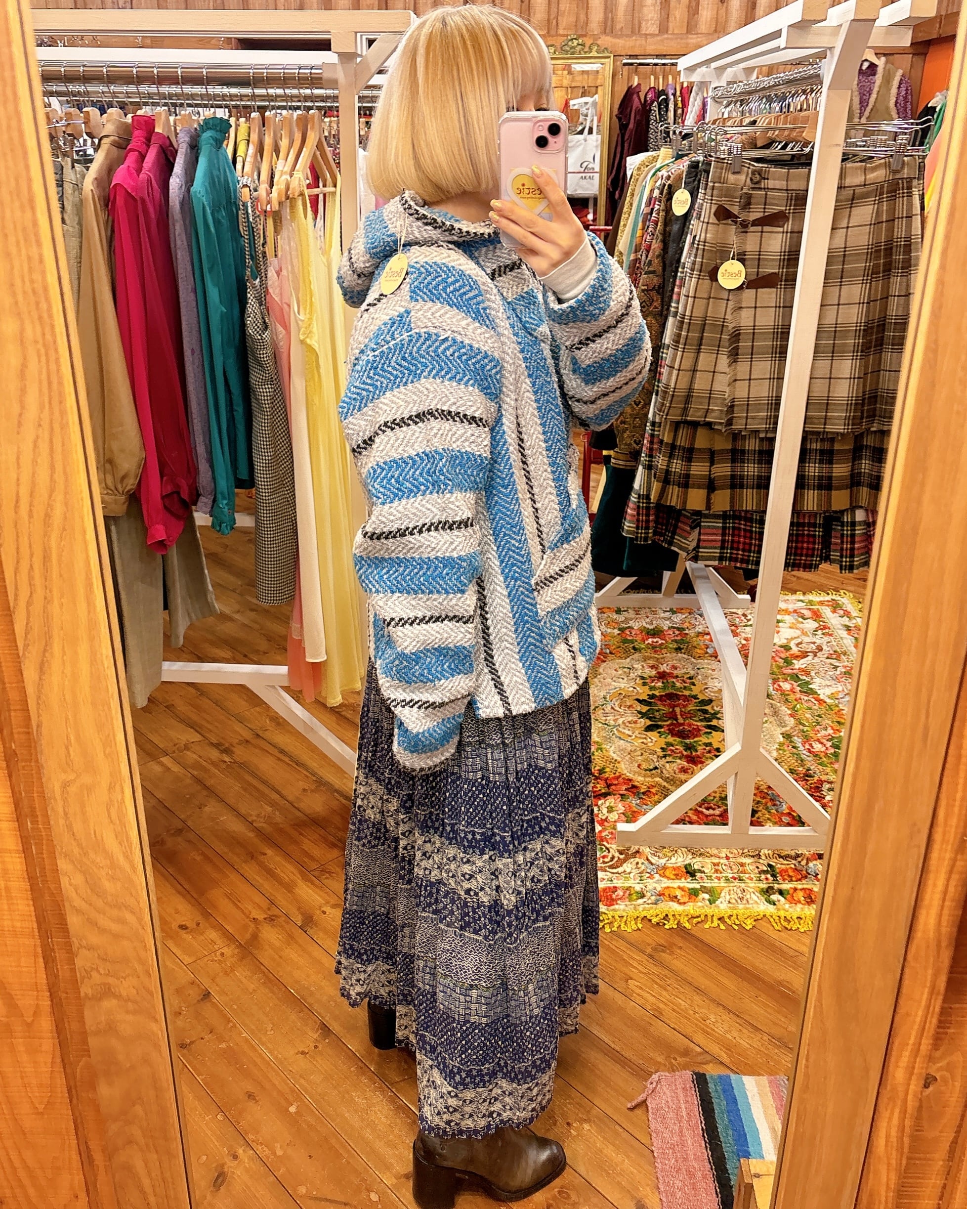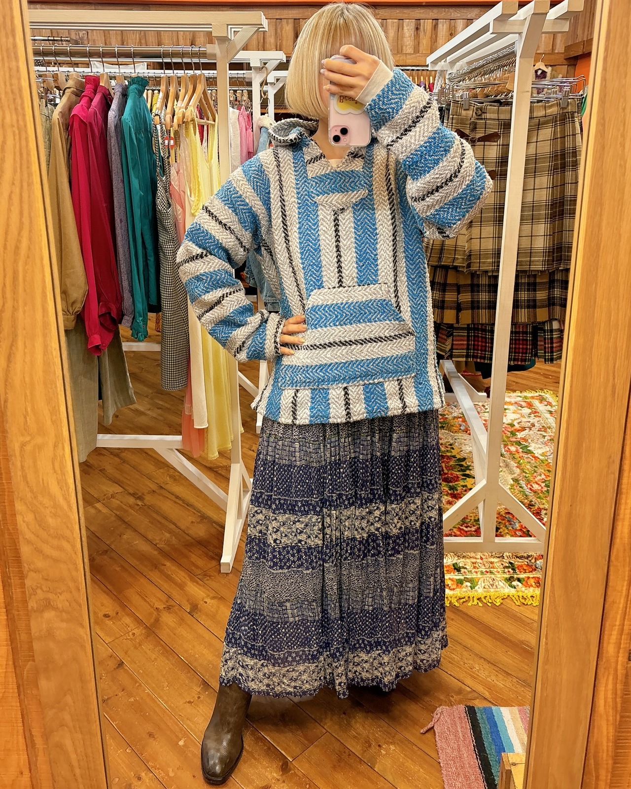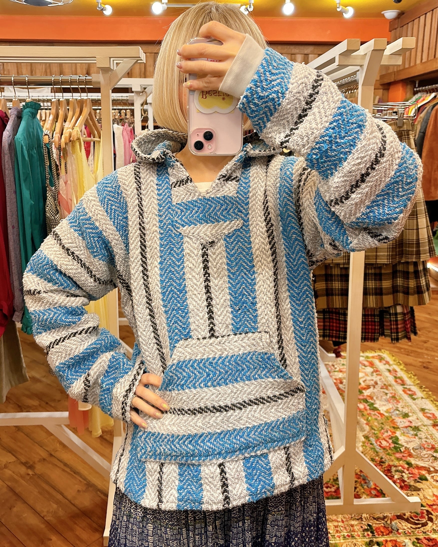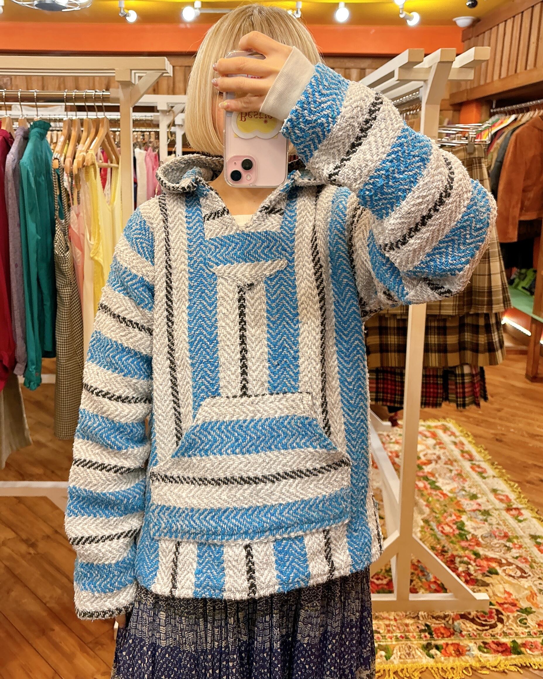 水色と明るいグレーのコントラストがとても爽やかなメキシカンパーカーです。サイズ感も大きすぎず女性の方も着やすいと思います。