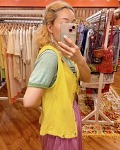 前開きで着用するベストです。全部閉じてトップスとしても着用可能。クリアのボタンが涼しげでかわいいです。ワイドシルエットのデニムやボリュームあるロングスカートなどと相性のよさそうです。