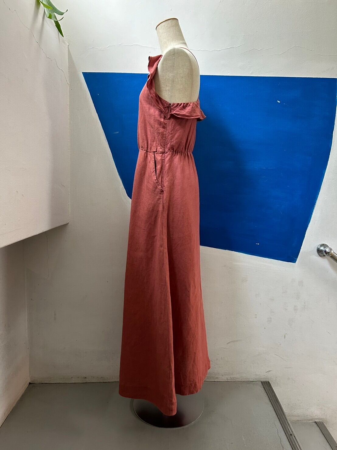 落ち着いたピンクにクロスしたバックデザイン、くるっと囲むようなフリルが可愛らしいワンピースです。