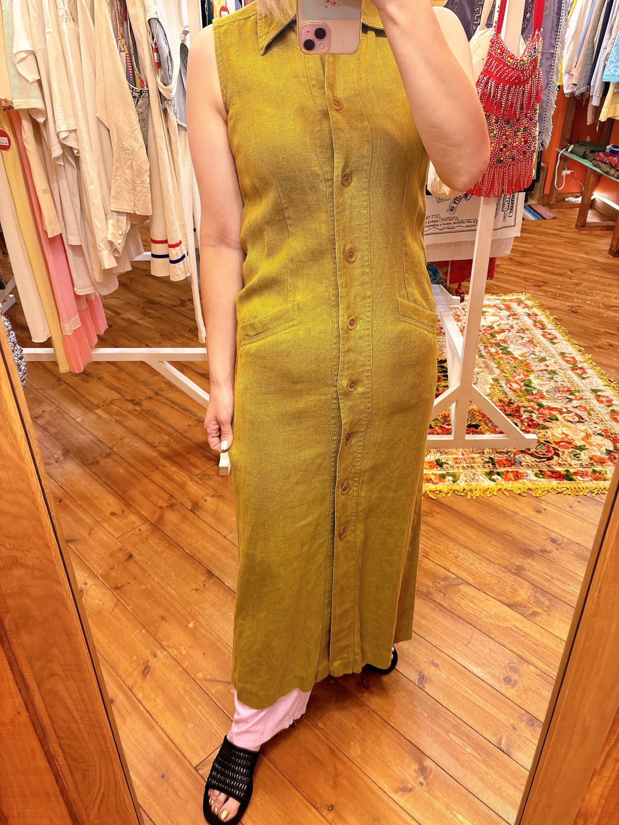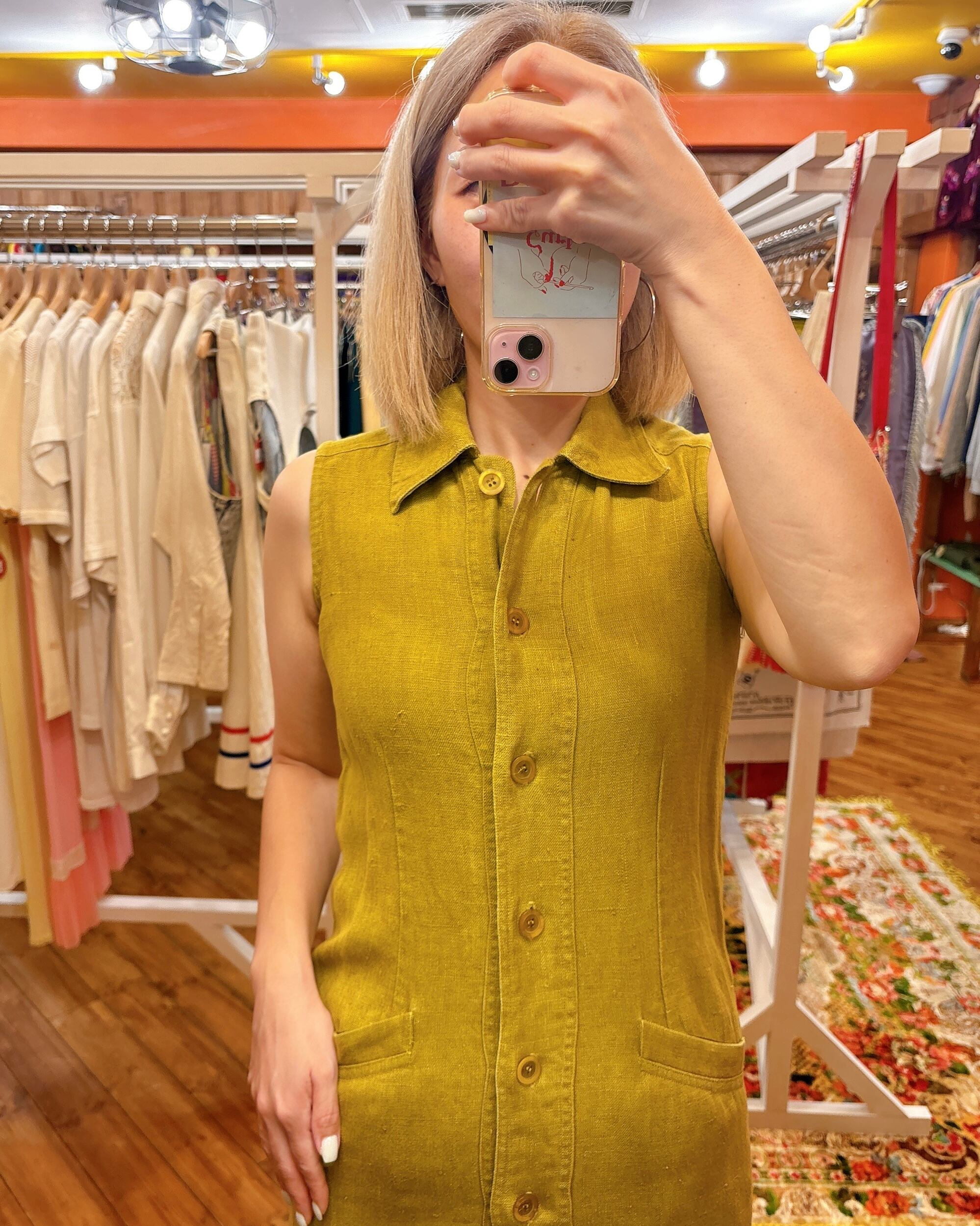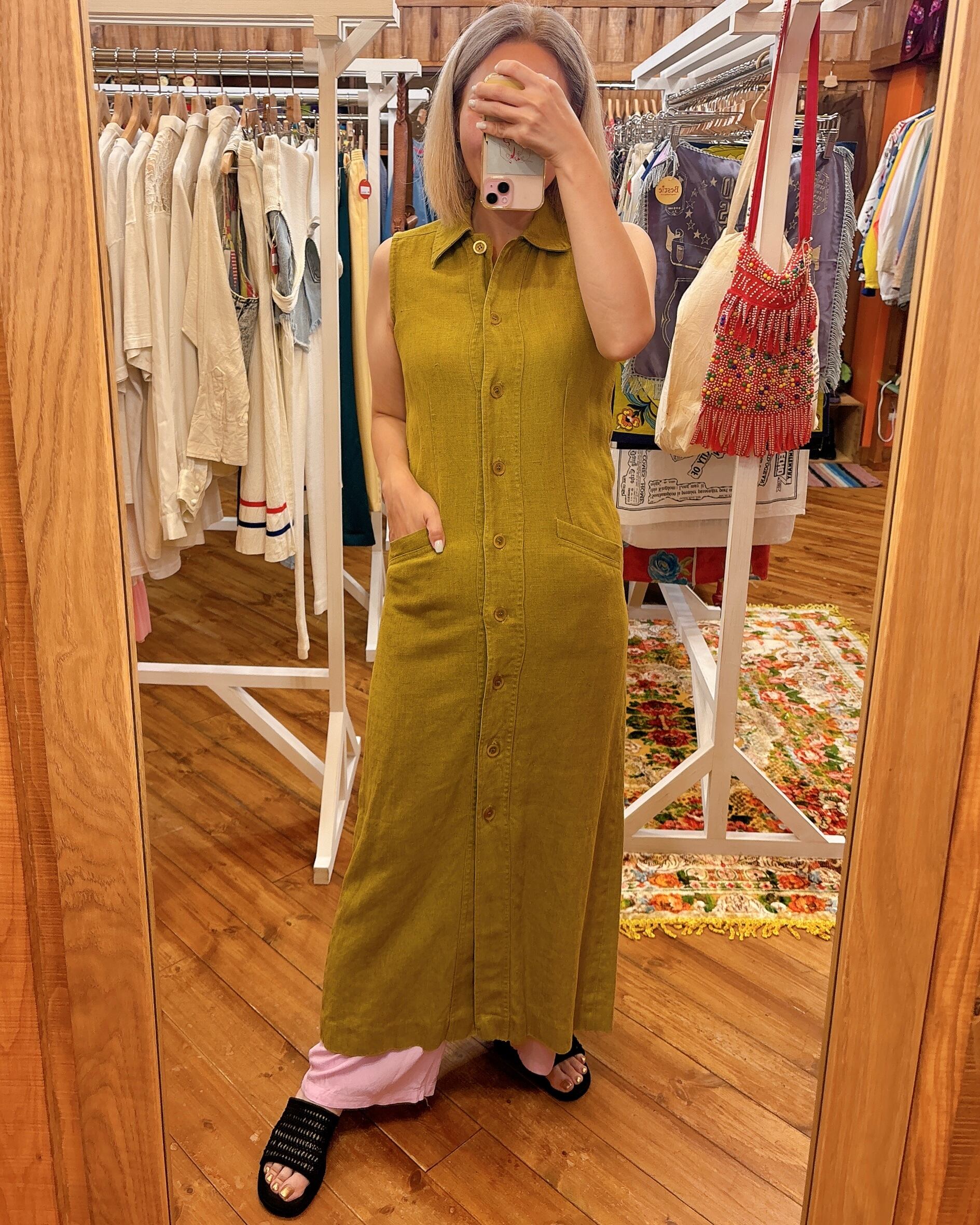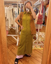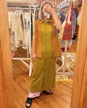 肩のラインが内側に少しはいるようなデザインのワンピースです。前がボタンで全開しますので、ロングジレのような感覚で羽織として使っても可愛いです。