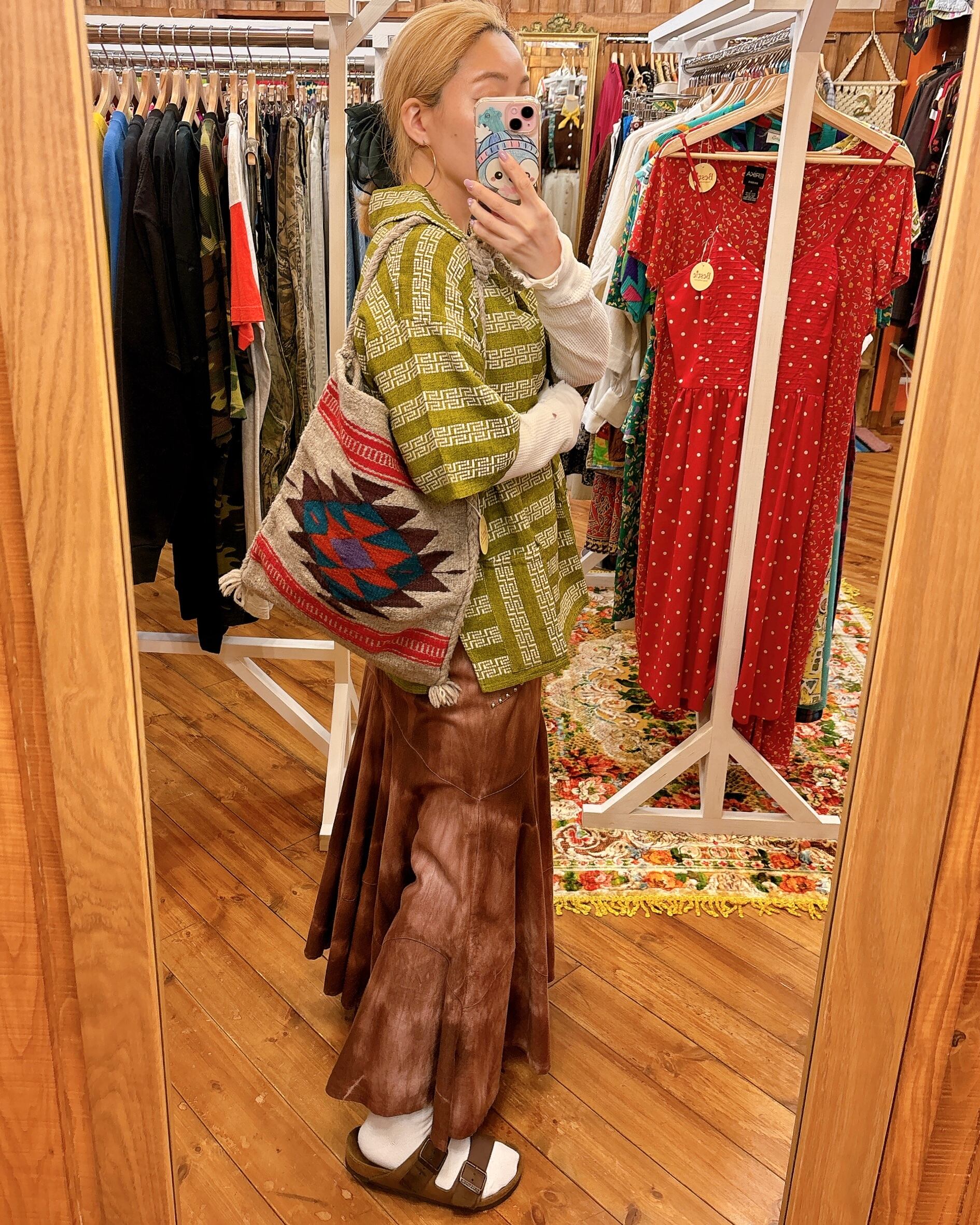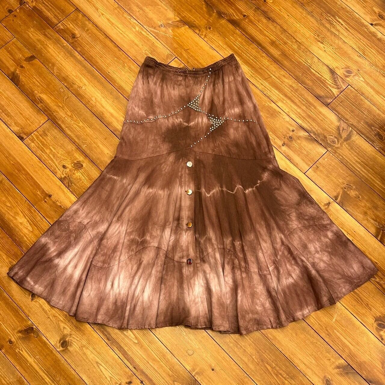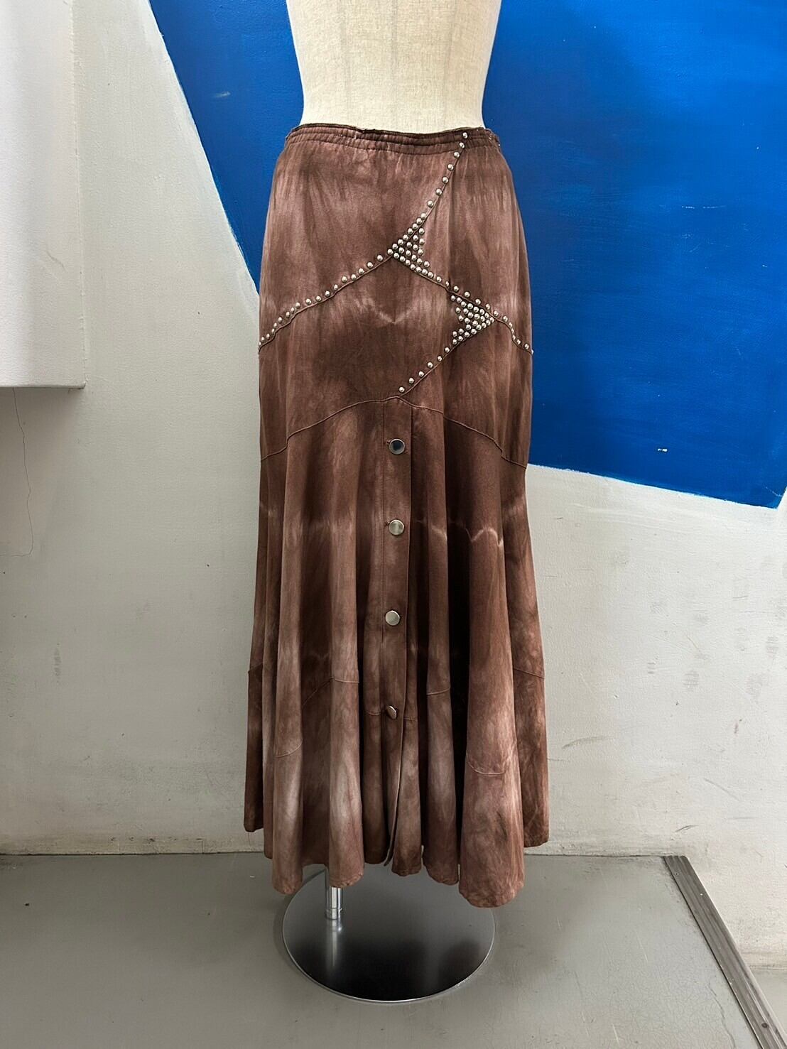 ややローライズなデザインのマーメイドスカートです。ムラ染めにスタッズのデザインがいい雰囲気です。一枚で着用するのも良いですし、ボトムスのレイヤードにもおすすめです。ウエストサイズ合えば男女問わずどうぞ!