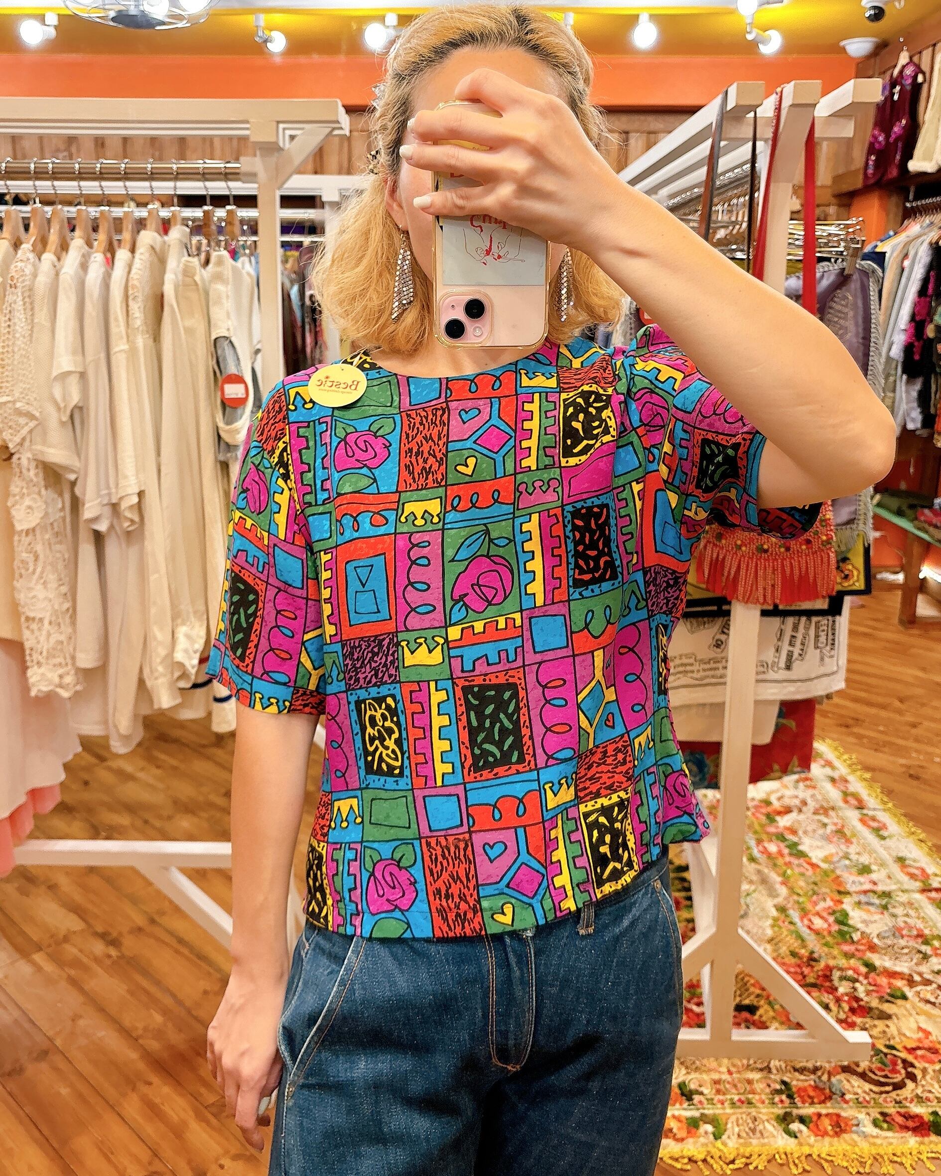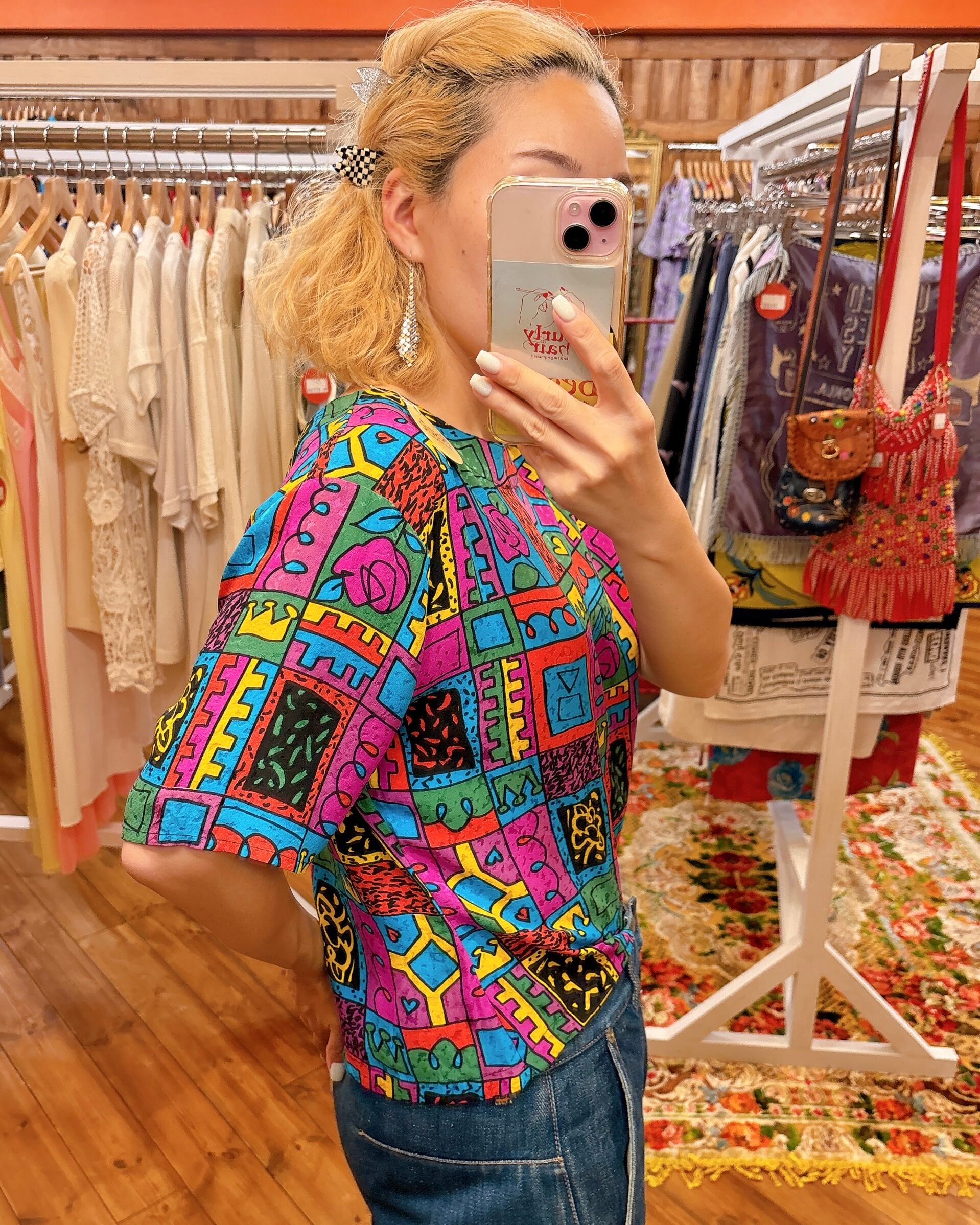 手書き風なタッチのイラストが全体にプリントされたシルクトップスです。薄手でひらひら、触り心地のよい軽めの生地です。避けないので1枚できやすいです。特筆するダメージなく良好です。