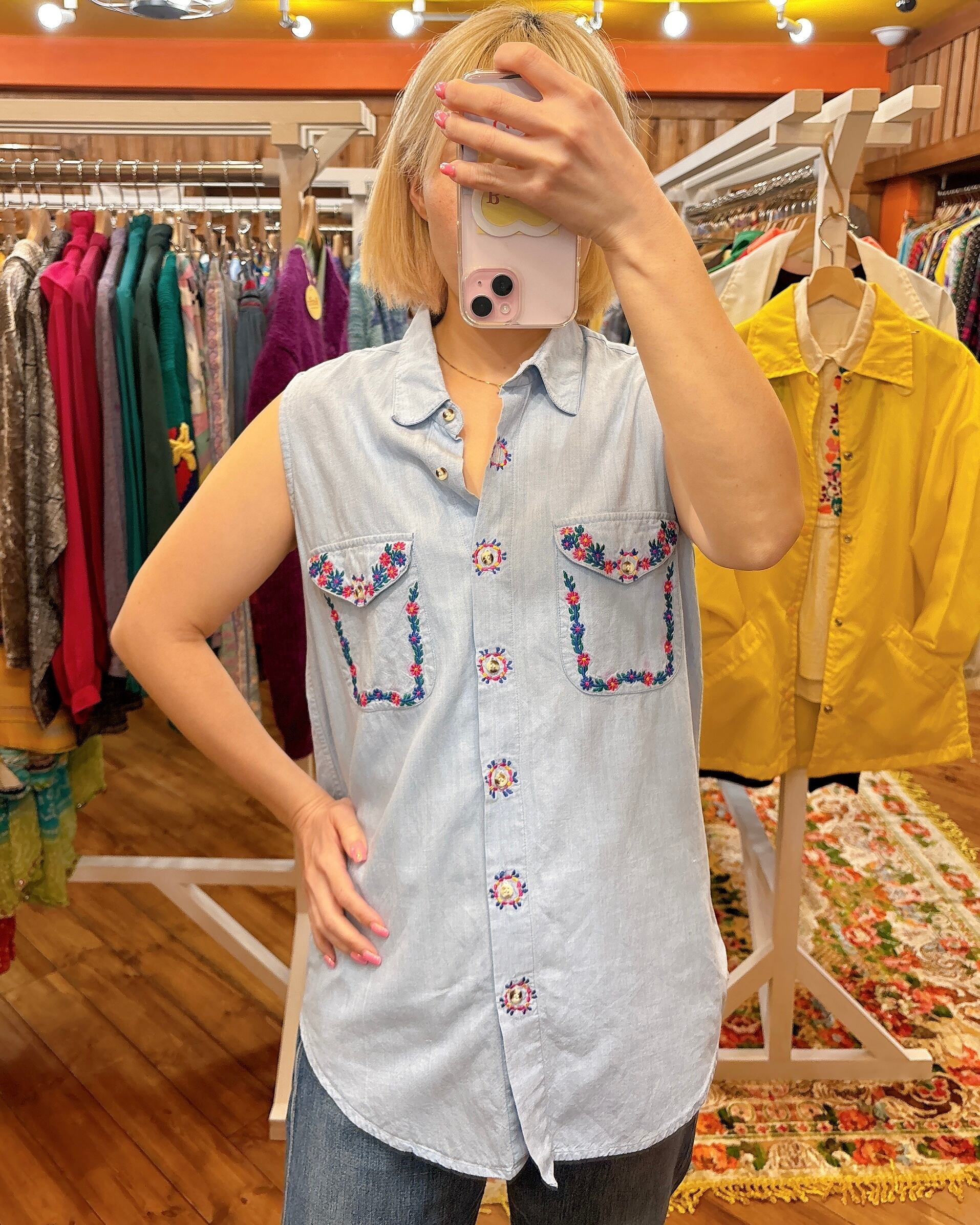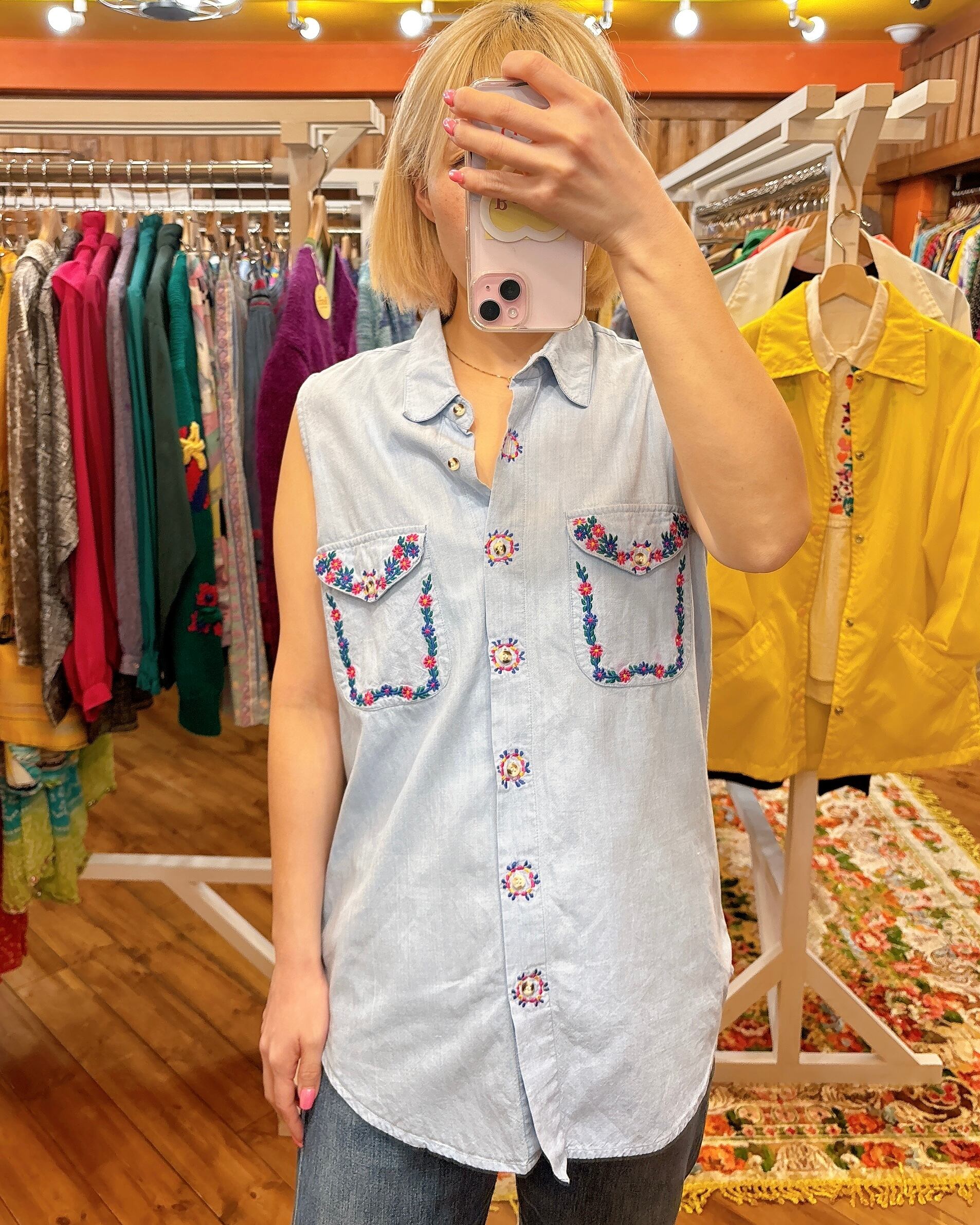 ポケット全体とボタンをひとつひとつ囲うように刺繍が入っています。明るい水色が爽やかで、清潔感ある印象です。かわいらしいデザインですが、肩がしっかりでて、着丈が少し長めなのでラブリーすぎずパンツスタイルにハマりそうなノースリーブシャツです。普段マニッシュなお洋服がお好きな方にもおすすめ。