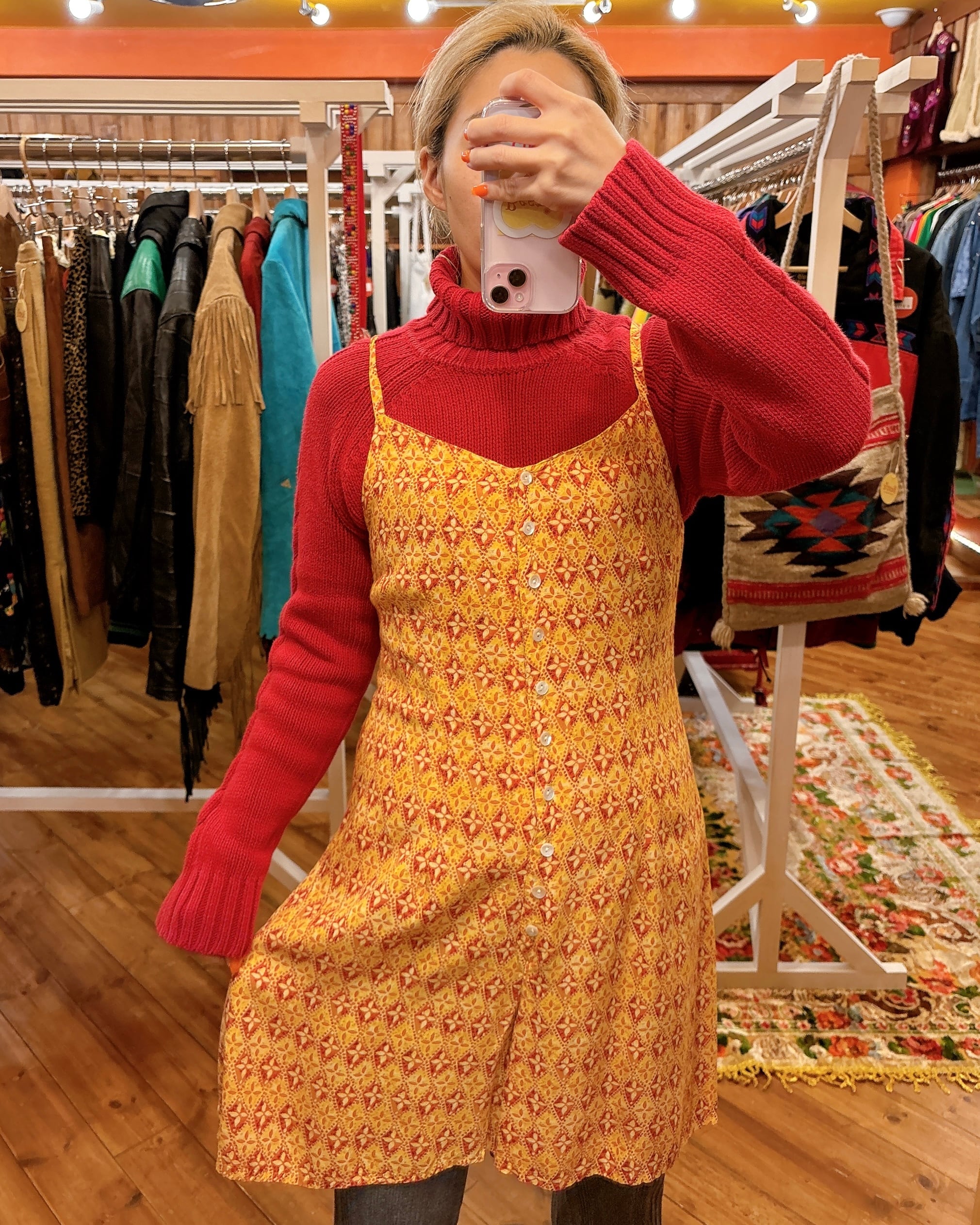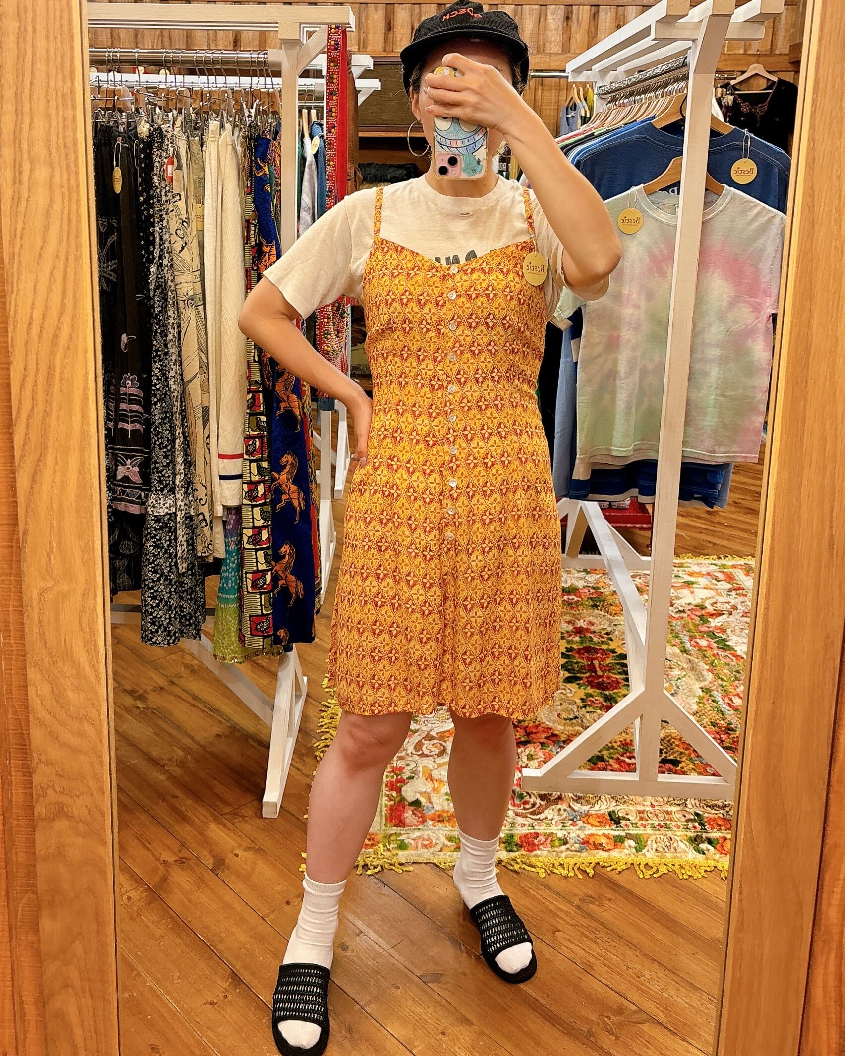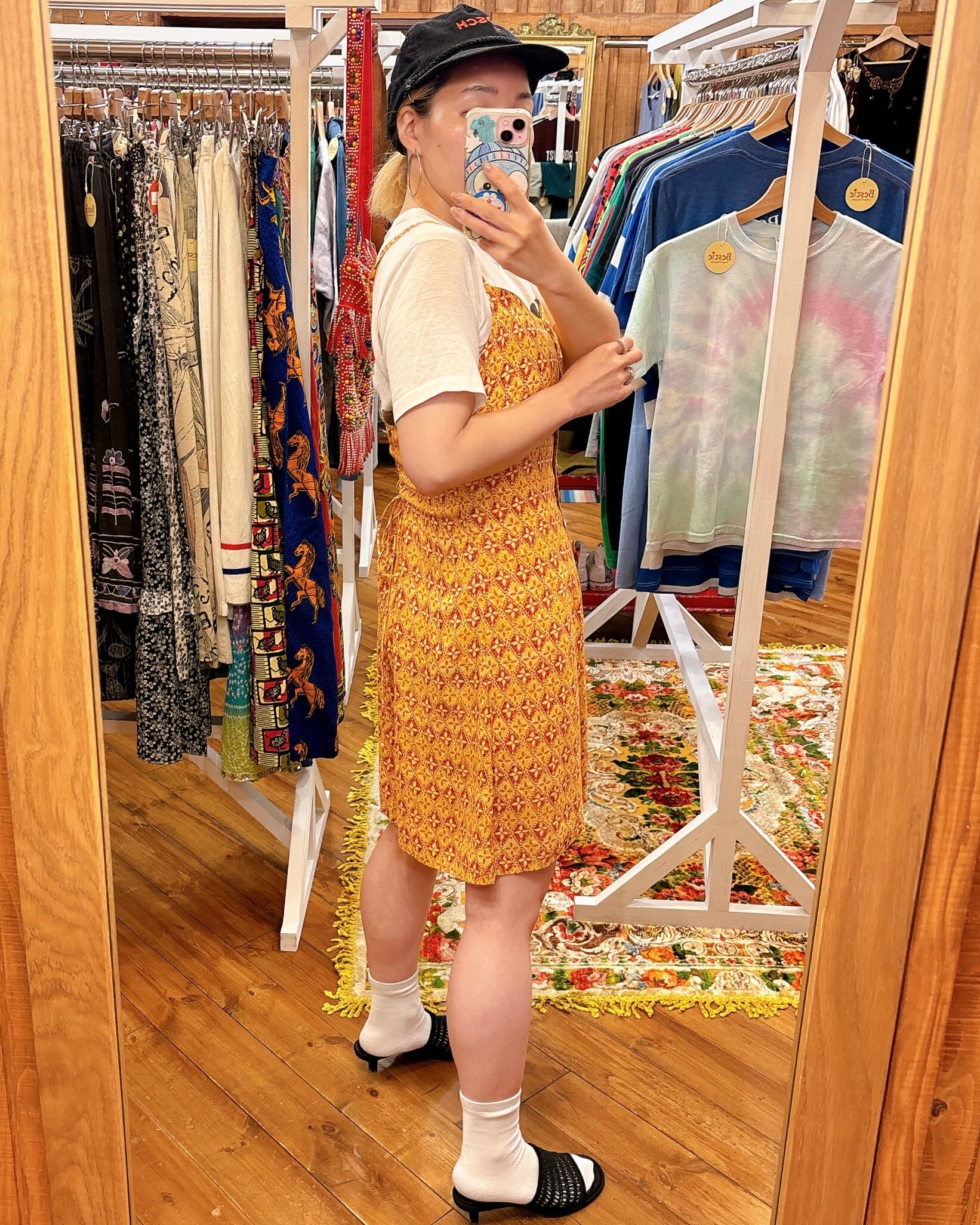首後ろのメーカータグがカットされているので年代等正確には不明ですが、触り心地的にちょっと古いレーヨンのテロテロ生地です。レーヨンですがご自宅でお洗濯できる素材です。