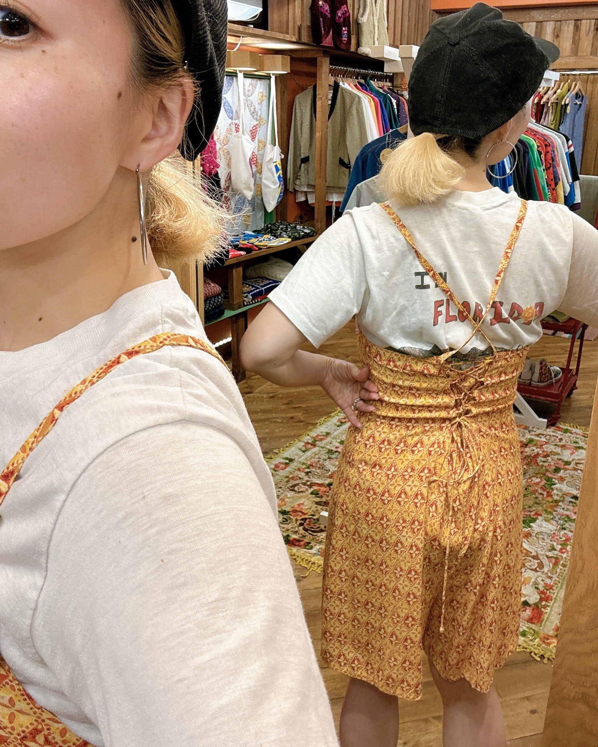 ボタンもシェルで柄もリゾート感あるエスニック柄です。キャミ紐でレースアップのデザインも女子感あってはなまる!ミニスカではなくパンツなところも一枚で着やすいです。