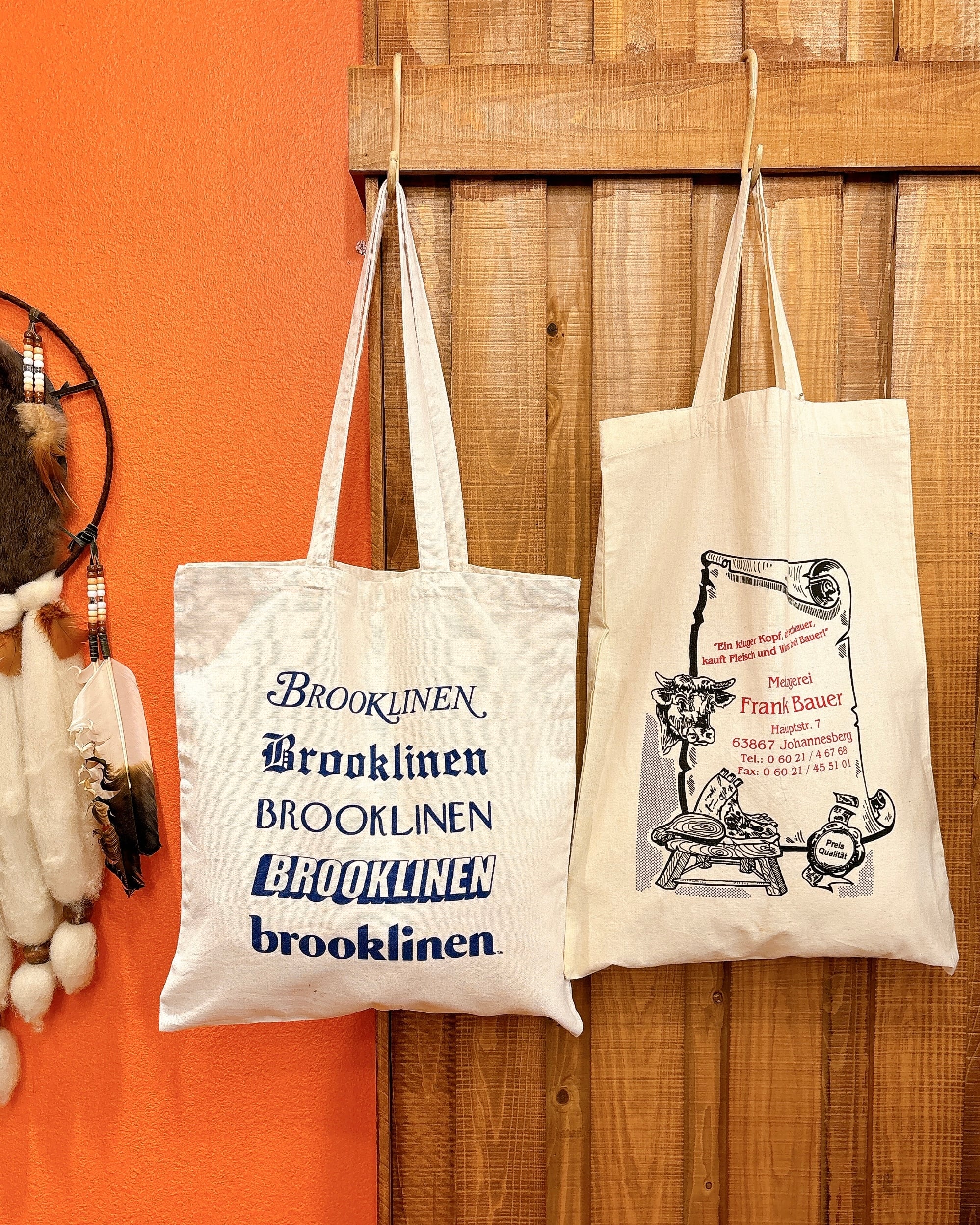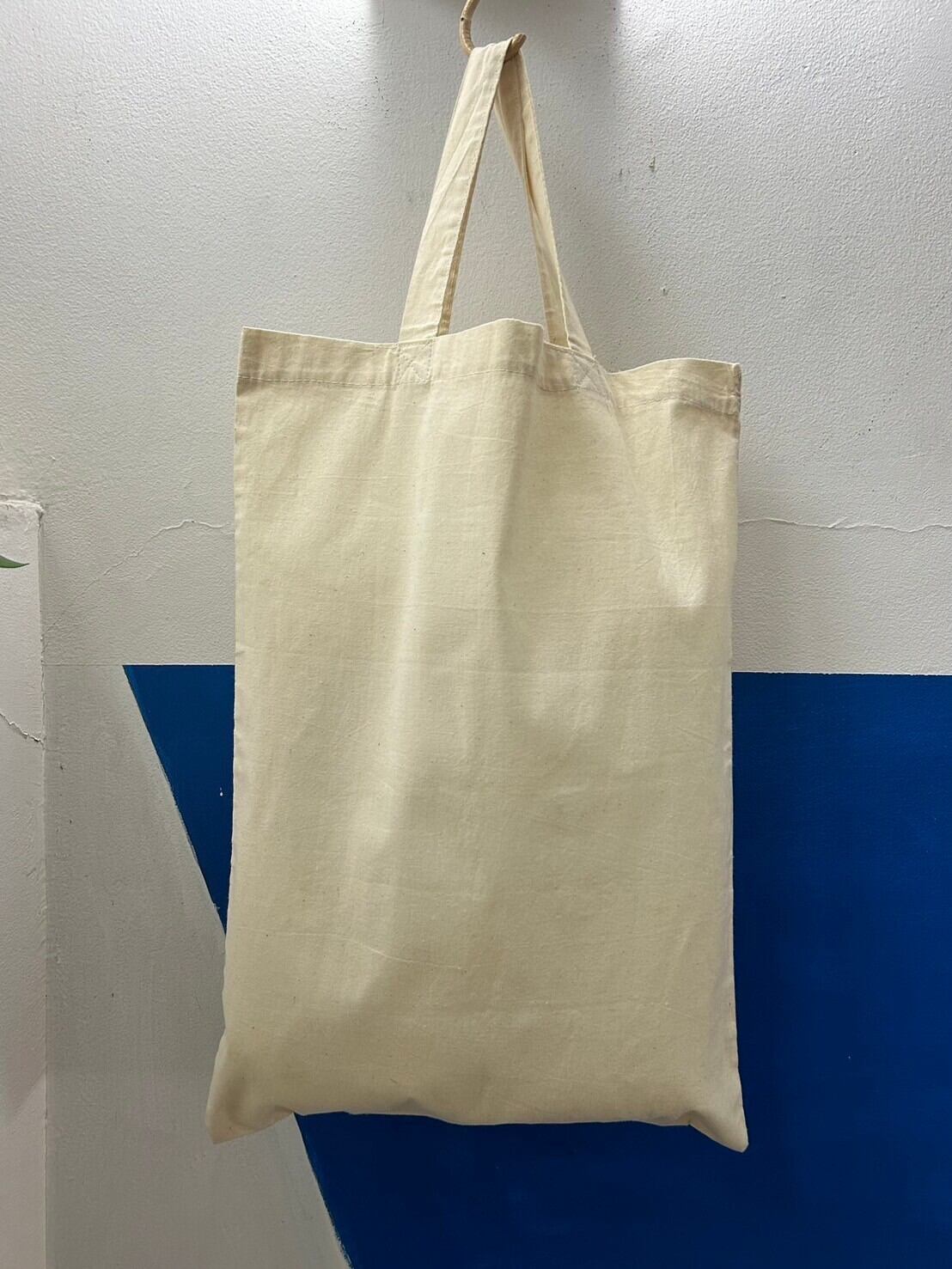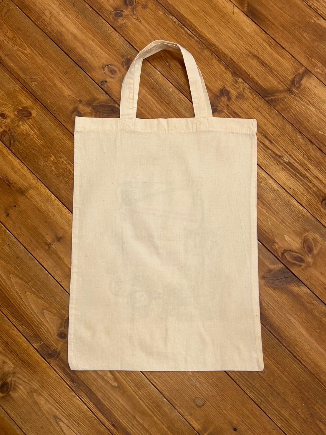 薄いコットン素材でプリントが入ったトートバッグです。まちはありません。