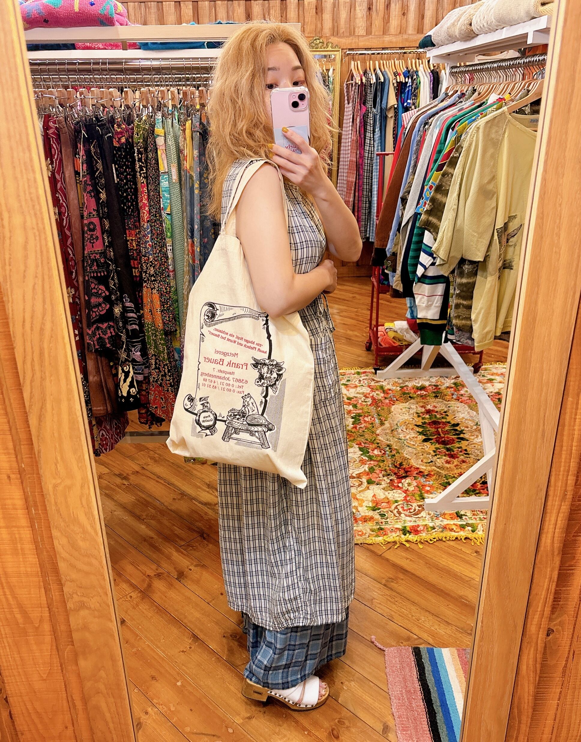 縦長の形がなんだかユニークでプリントのイラストもとてもかわいいです。折りたたんで、エコバッグとして持ち歩きにもおすすめです。