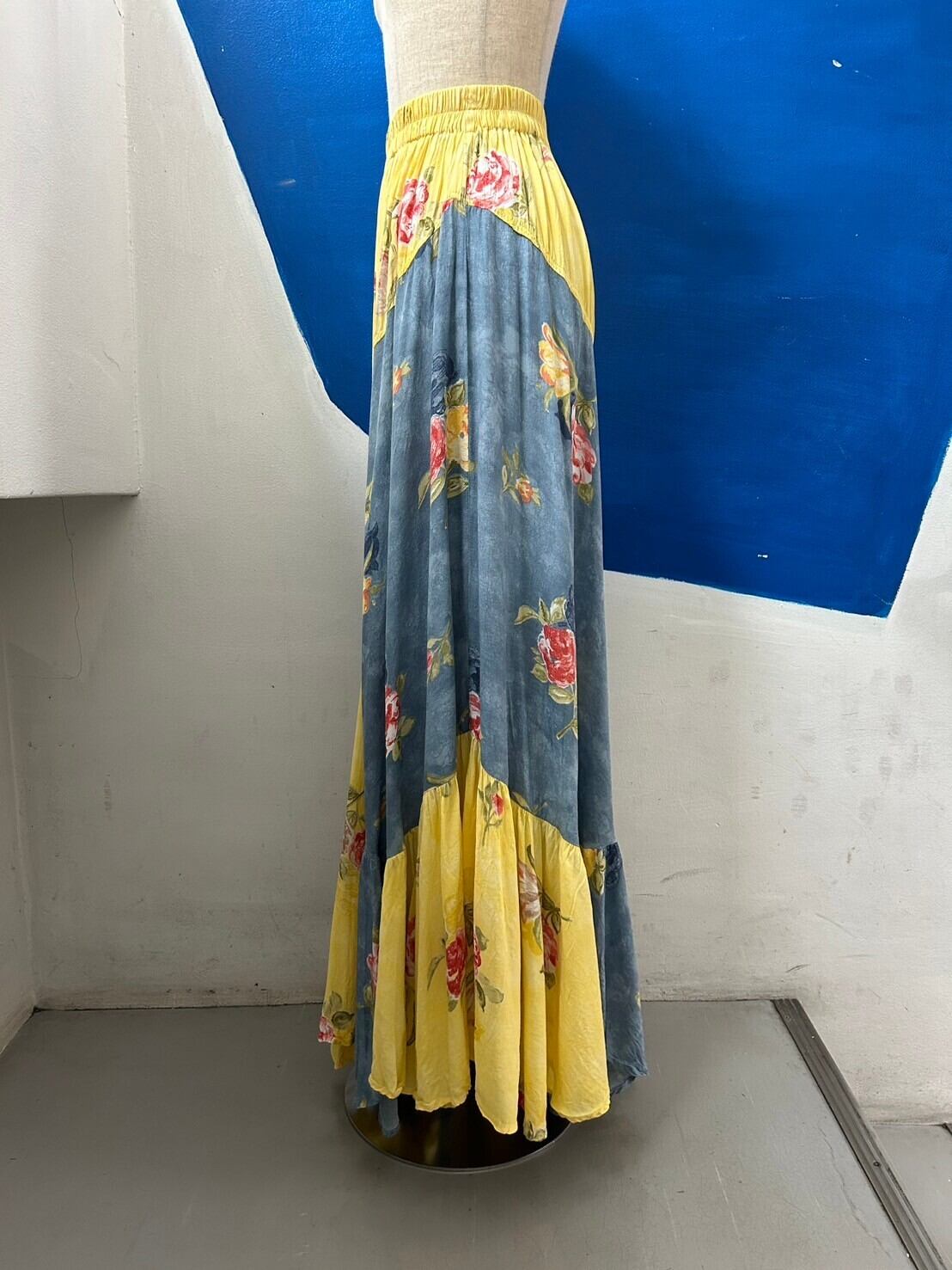 黄色と青の生地をパネル状にして組み合わせたロングスカートです。とてもたっぷり生地を使用していますので、裾が波打つようなシルエットですが広がり過ぎずとても上品でgood!!すごくかわいいビンテージスカートです。