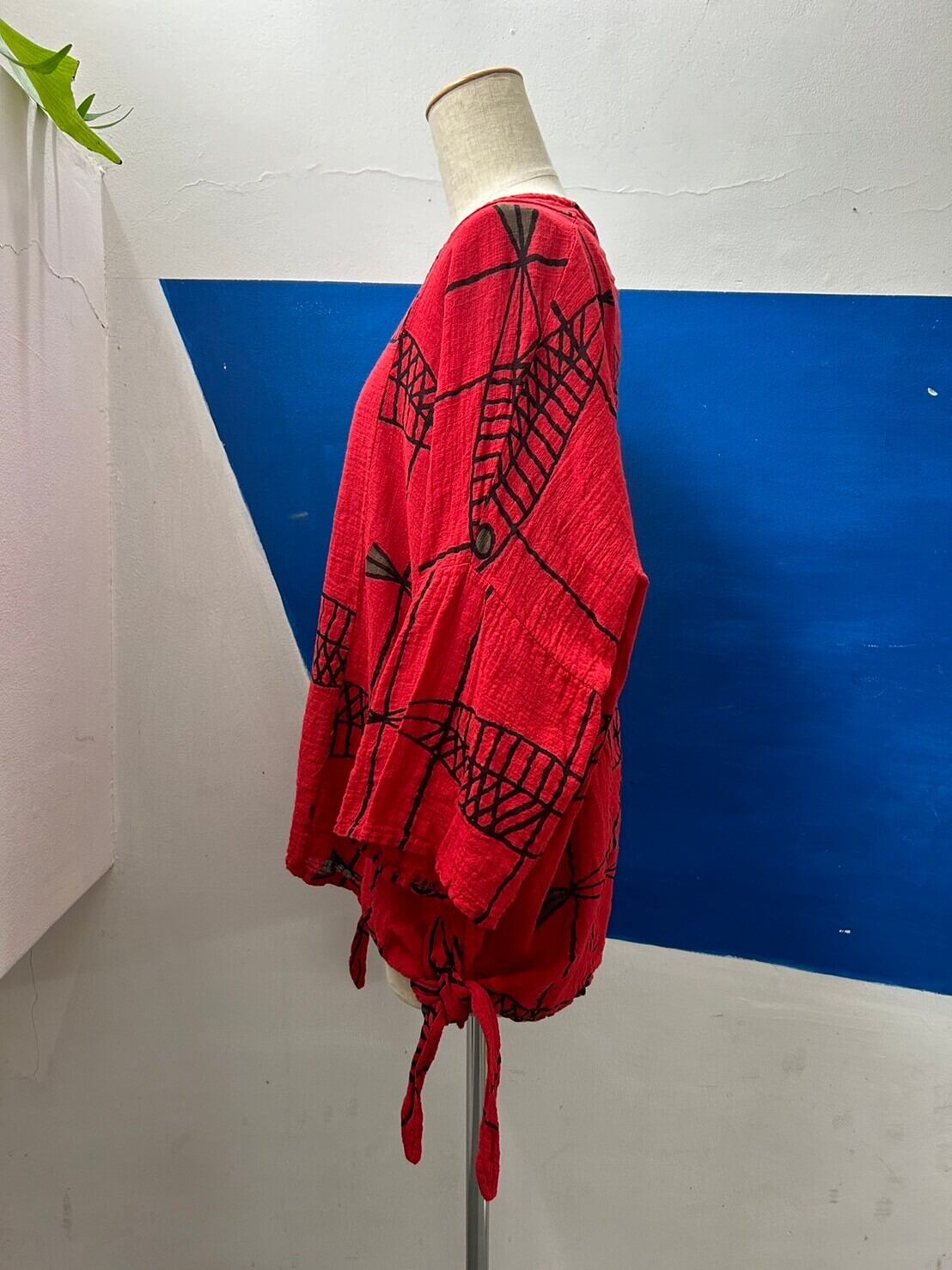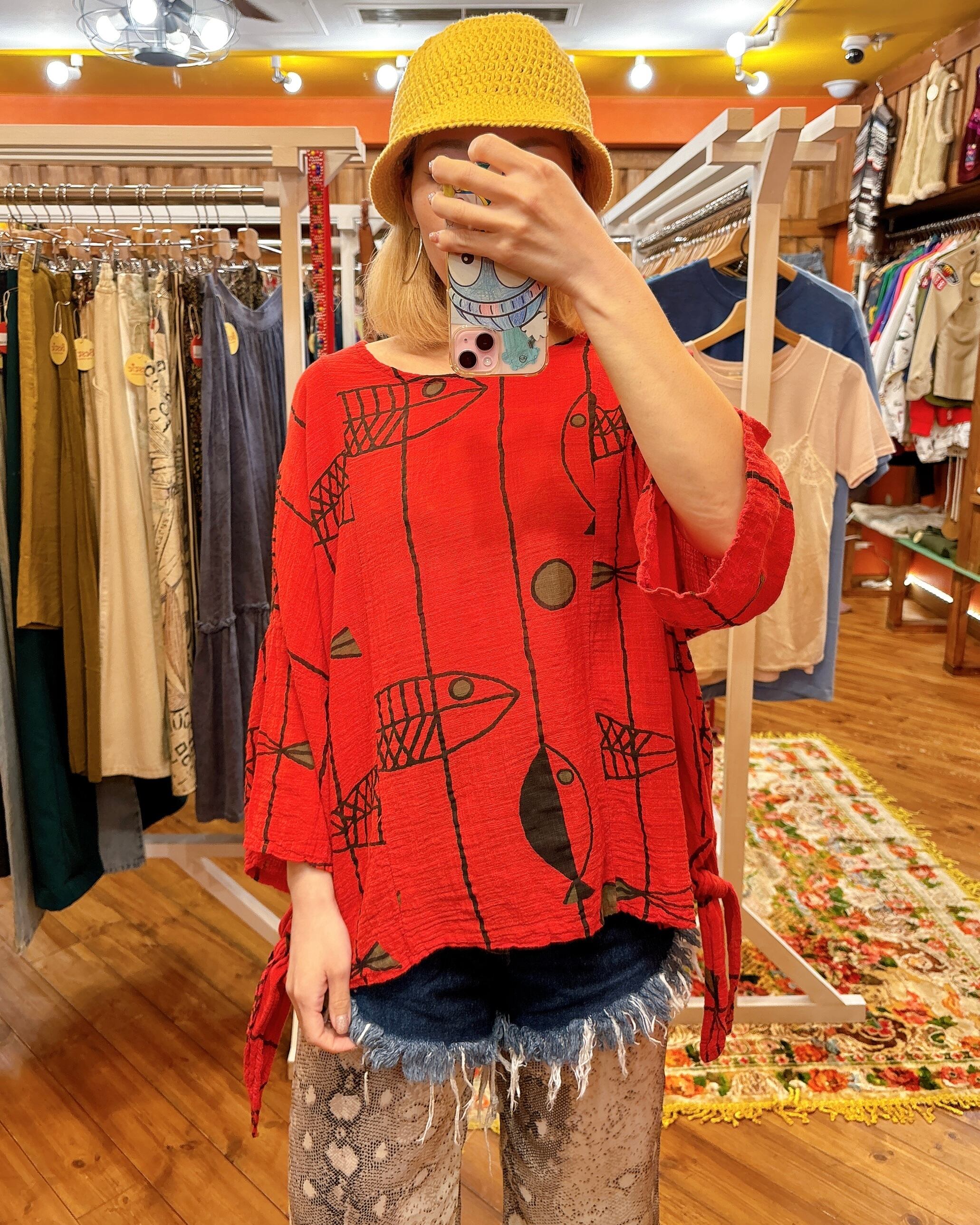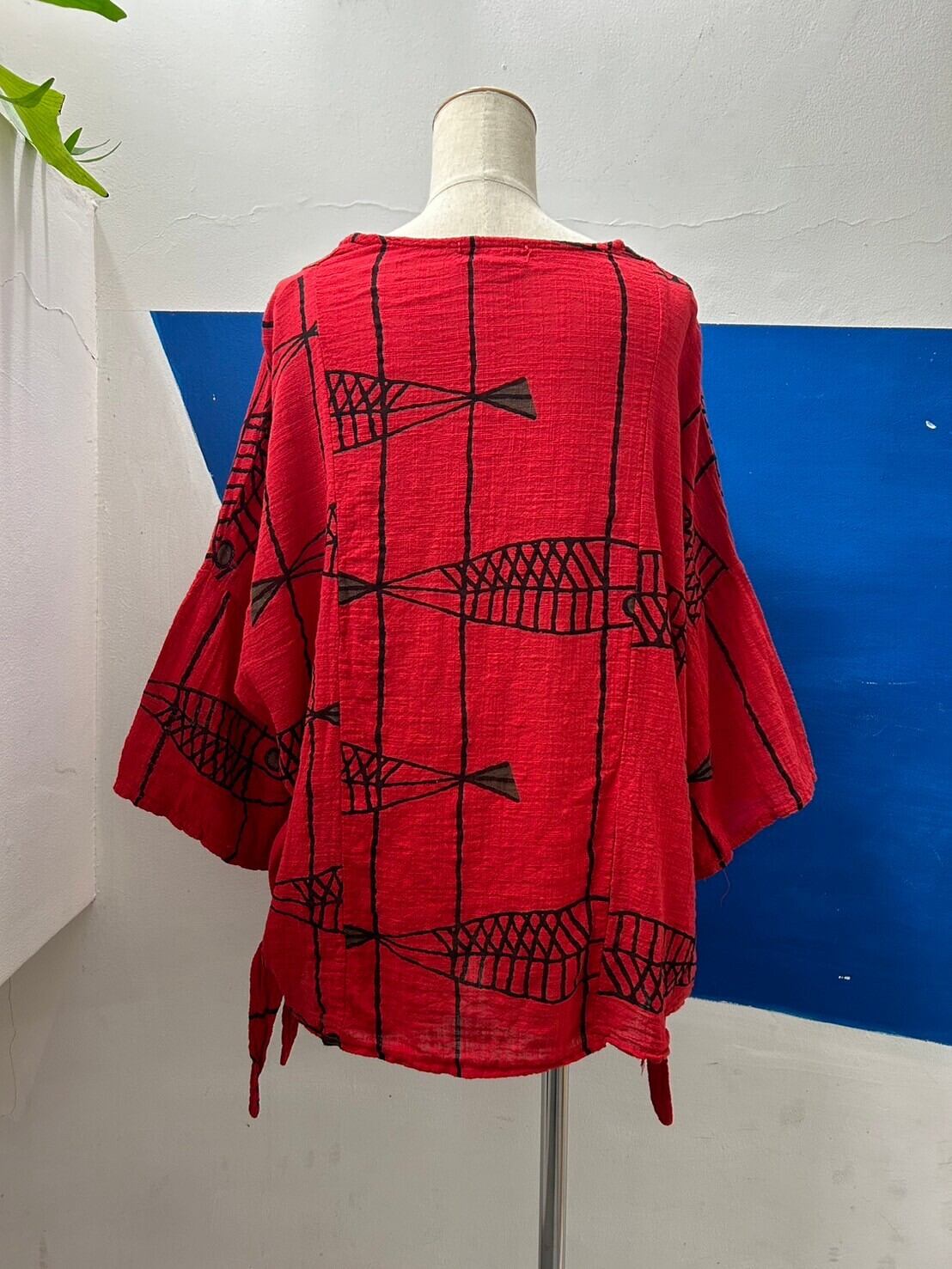 リネン素材でエスニックなお魚柄とはまたちょっと違ったモダンなお魚柄です。赤ですがオレンジ寄りではなくて黒を混ぜたような深みのある色。