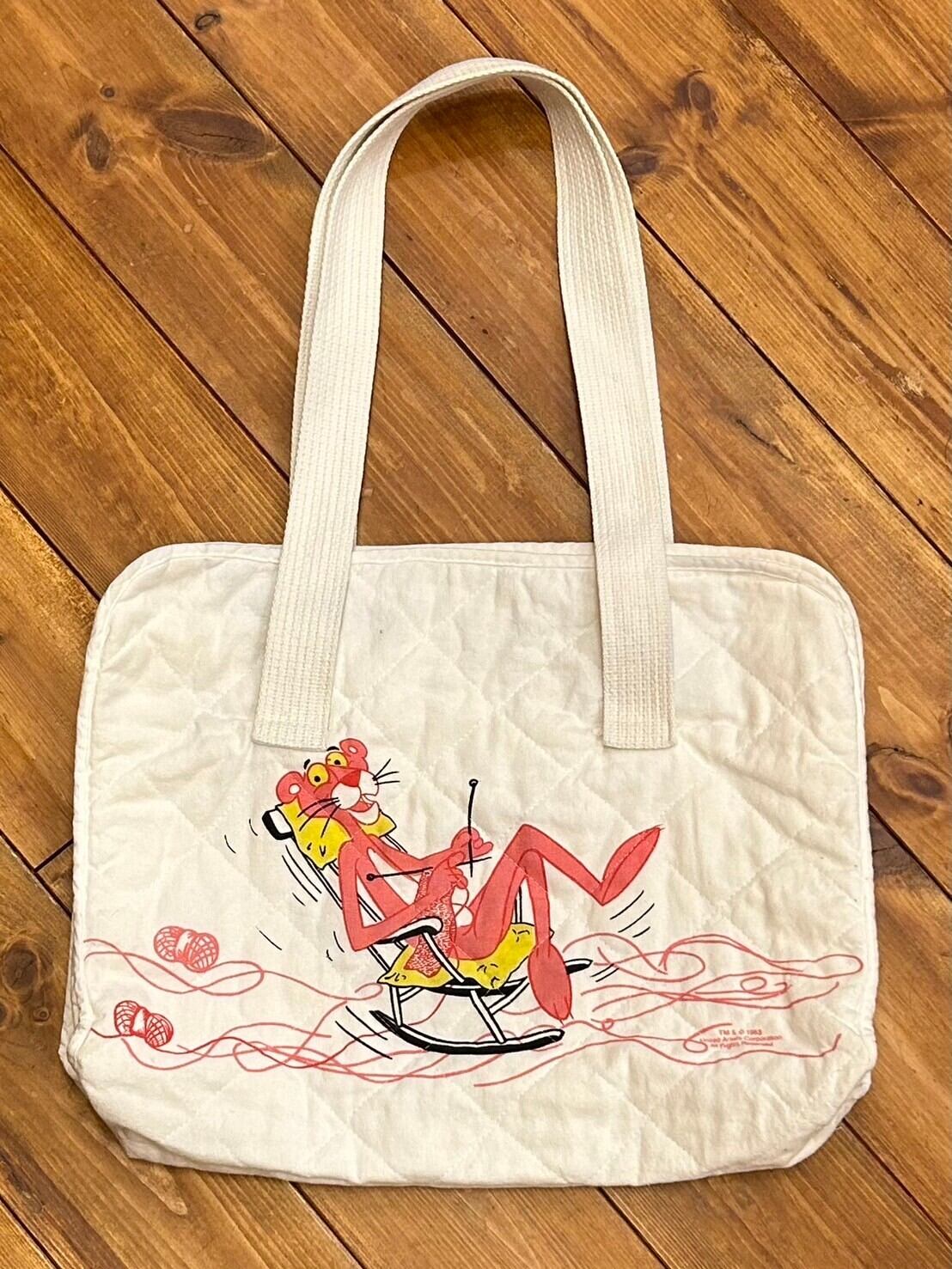 編み物をしているプリントが印象的なキルティングバッグです!白にピンクのコントラストがキュート!!バッグ本体は長方形の箱型のような形です。バッグの入れ口にジップやスナップなどはついておりません。