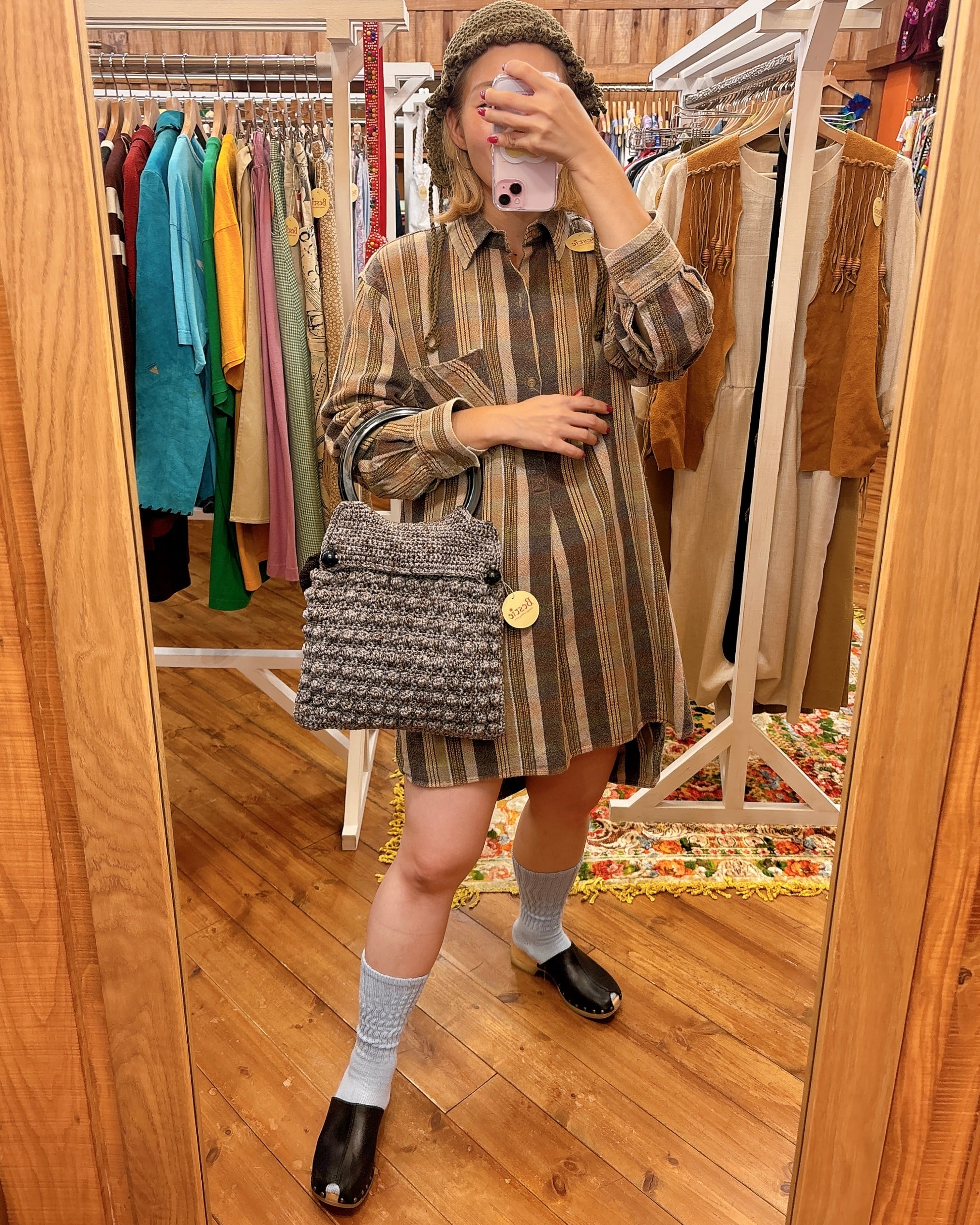 暗く落ち着きすぎないブラウンなので合わせやすいと思います。膝上丈のワンピ感覚で着用できます。