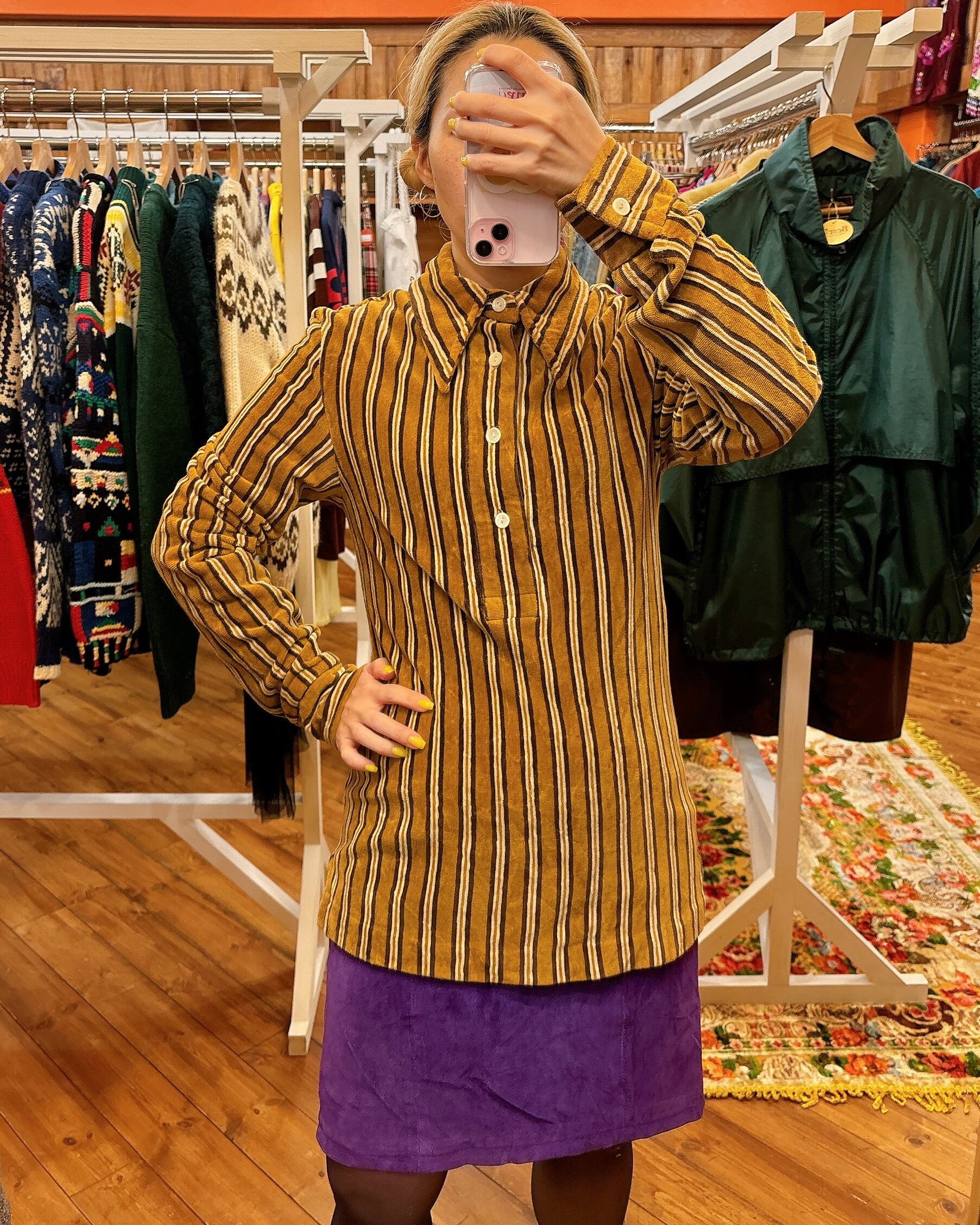 L/S ストライプ柄 レトロ ベロア プルオーバーシャツ