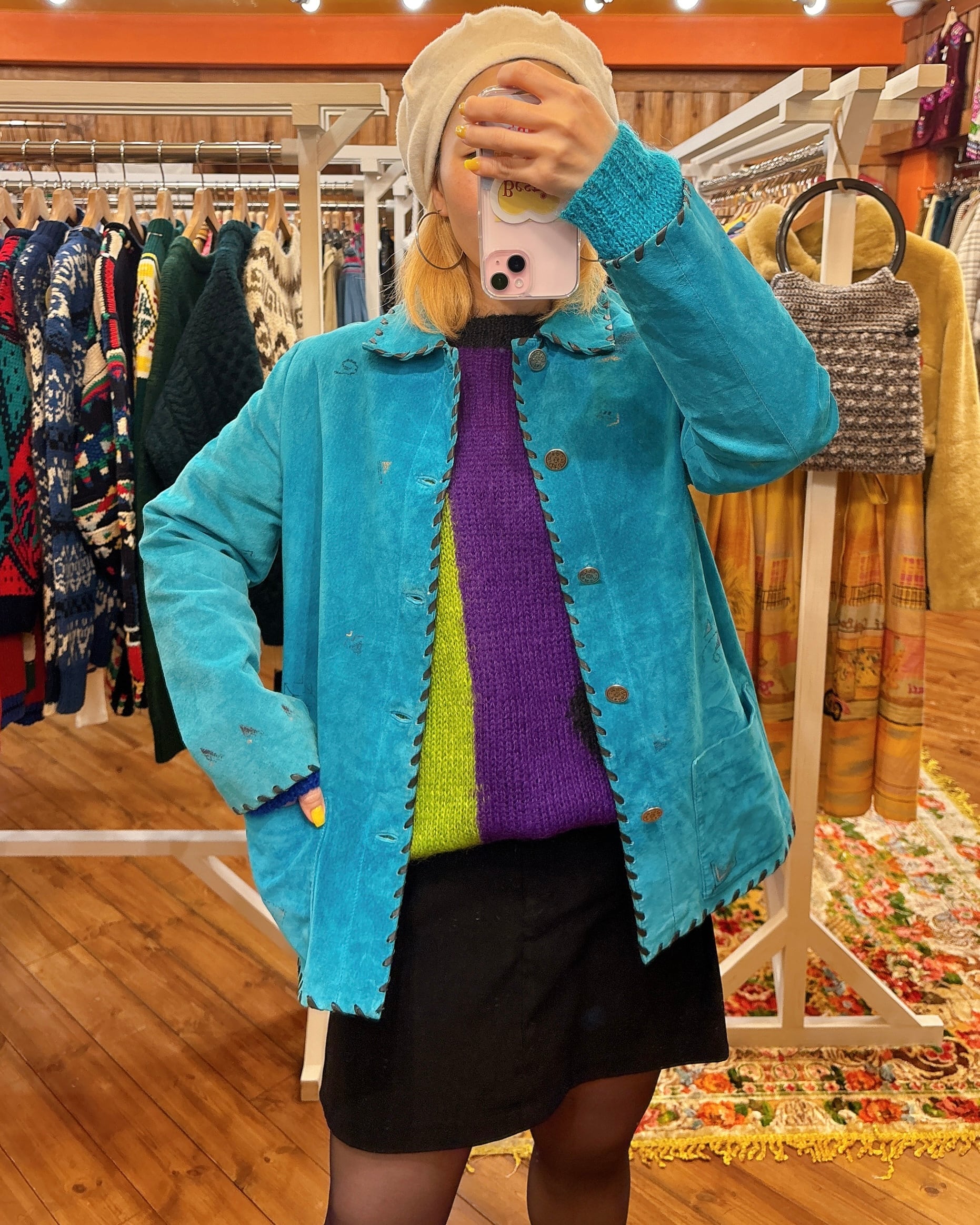 ターコイズブルーのスエードレザージャケット。ビンテージデザインをオマージュしたかすれたペイントもかわいいです!!