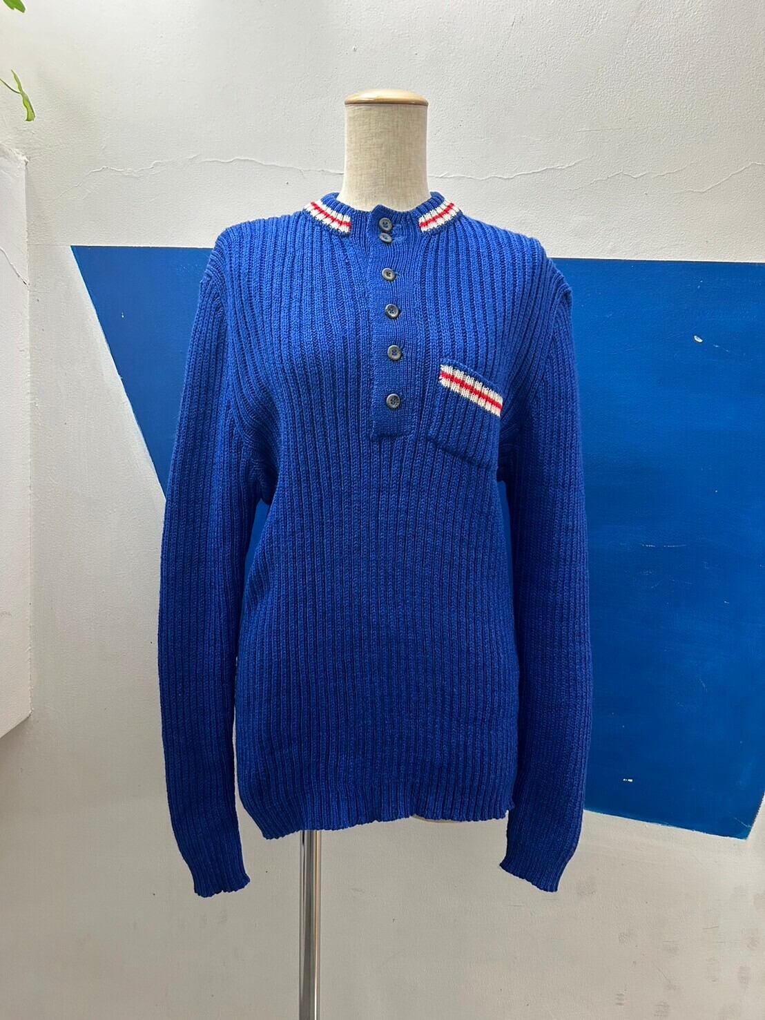 ヘンリーネックで横長の胸ポケットがかわいいセーターです。おそらくアクリルニット。柔らかくて伸縮性があり軽い着心地でした。着丈長く伸ばしてもきれますが、ウエストあたりで着丈を織り込んで着用してもかわいかったです。