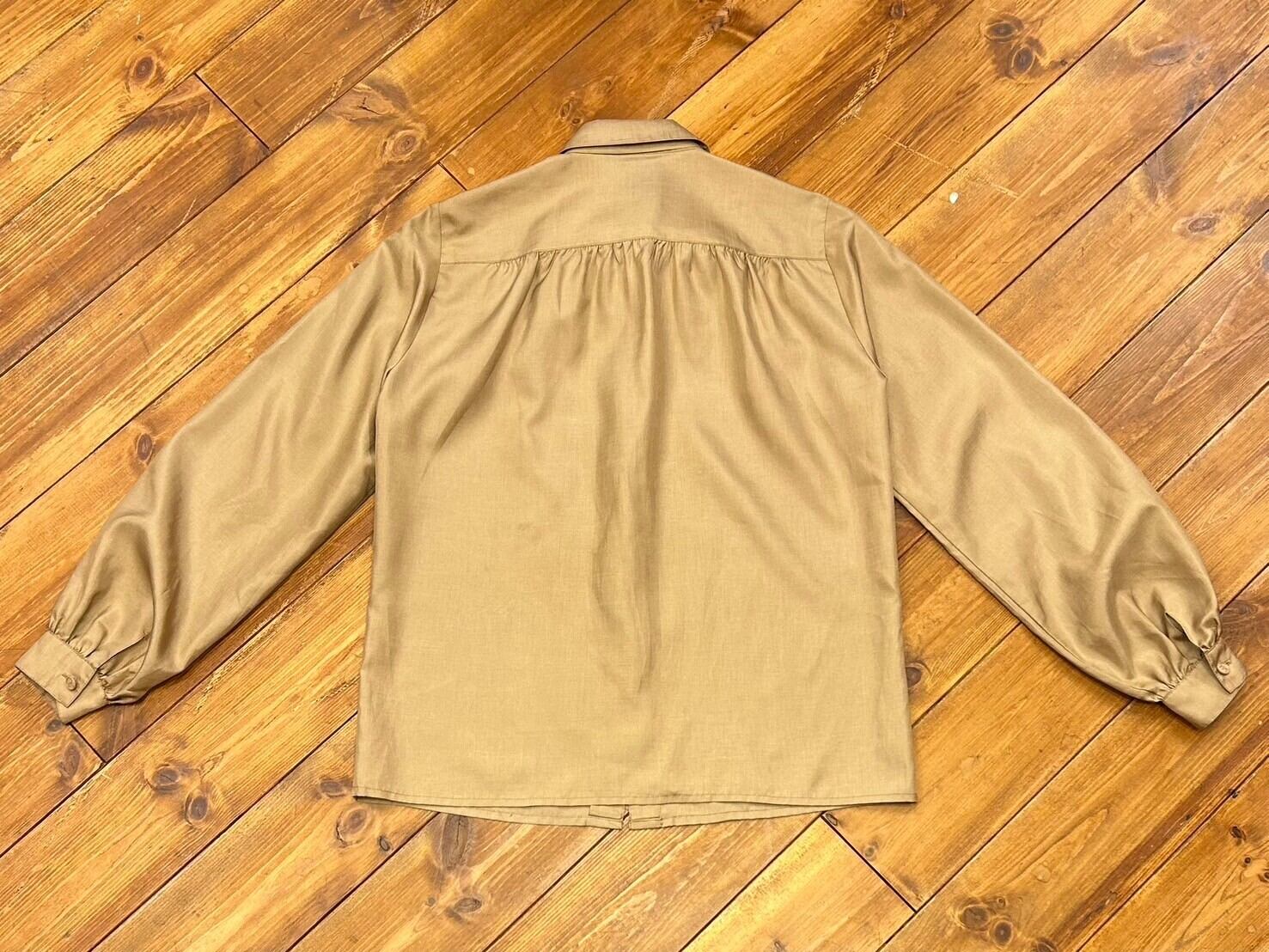 シンプルなデザインですが光沢のあるベージュで品のあるブラウスです。サイズも小さめなのでちょっとかしこまった雰囲気でお出かけしたいときや、お仕事着との兼用にもよさそうです。