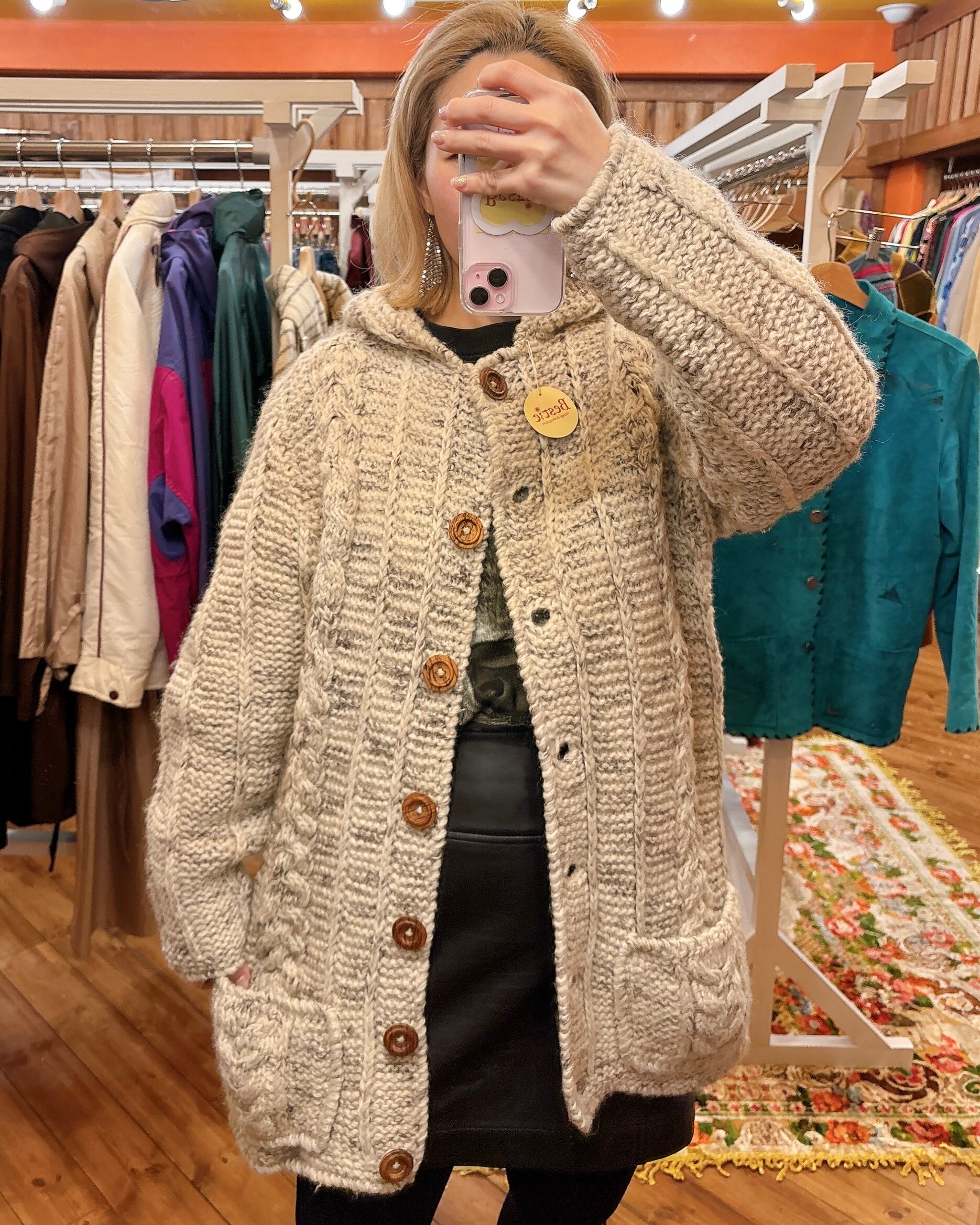 しっかりしたニットのフード付きコートです。