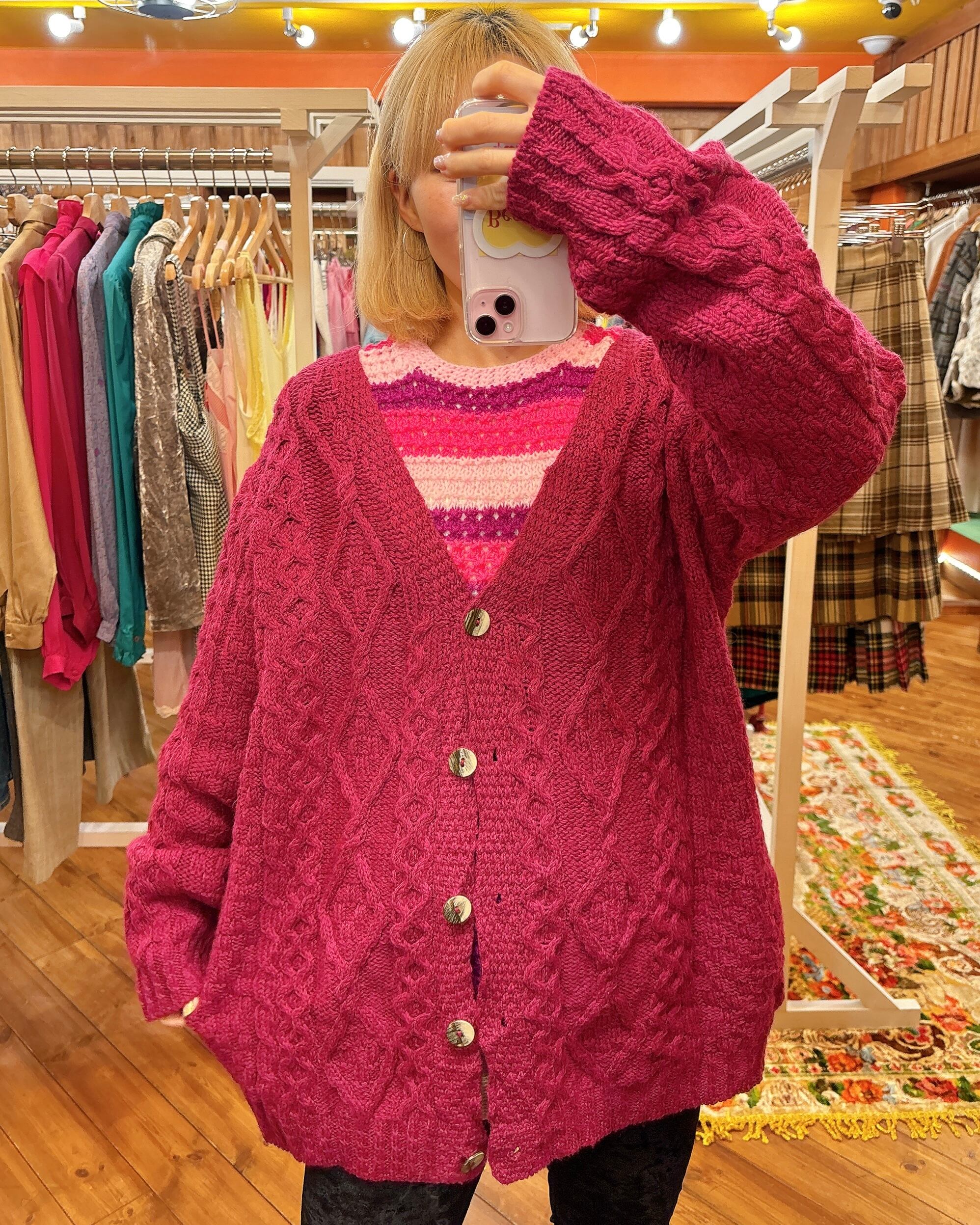 USEDの手編みのニットベストです。鮮やかなピンクからパープルのグラデーションになったボーダーラインがかわいいです!実寸の身幅はスリムですが肩幅、着丈はしっかりあり、ニットなので柔らかく伸縮性があります。