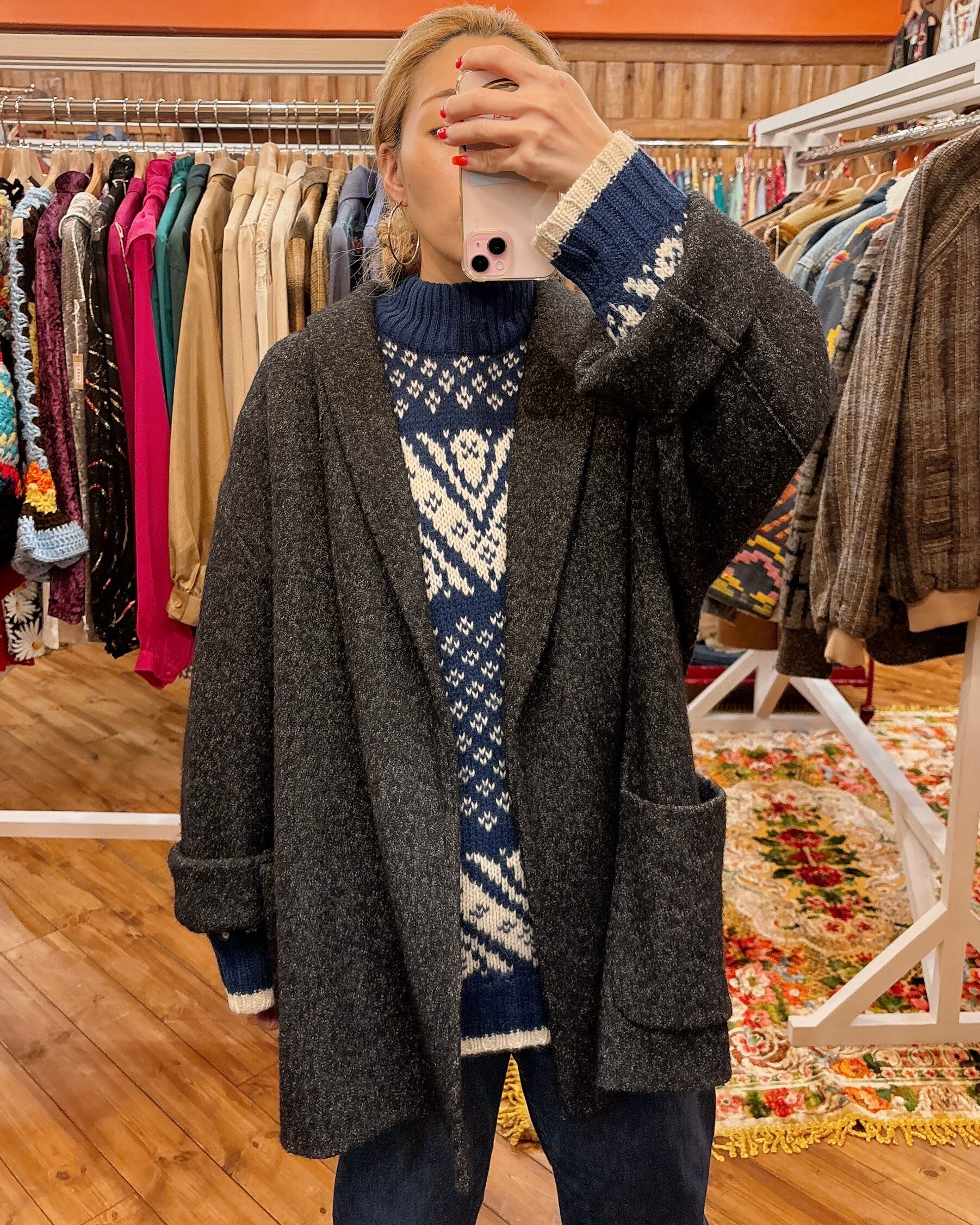 フロントボタンなどはとくになく、前開けで軽く羽織れるパイルニットのジャケットです。両側にポケットあり。胸ポケットは飾りです。