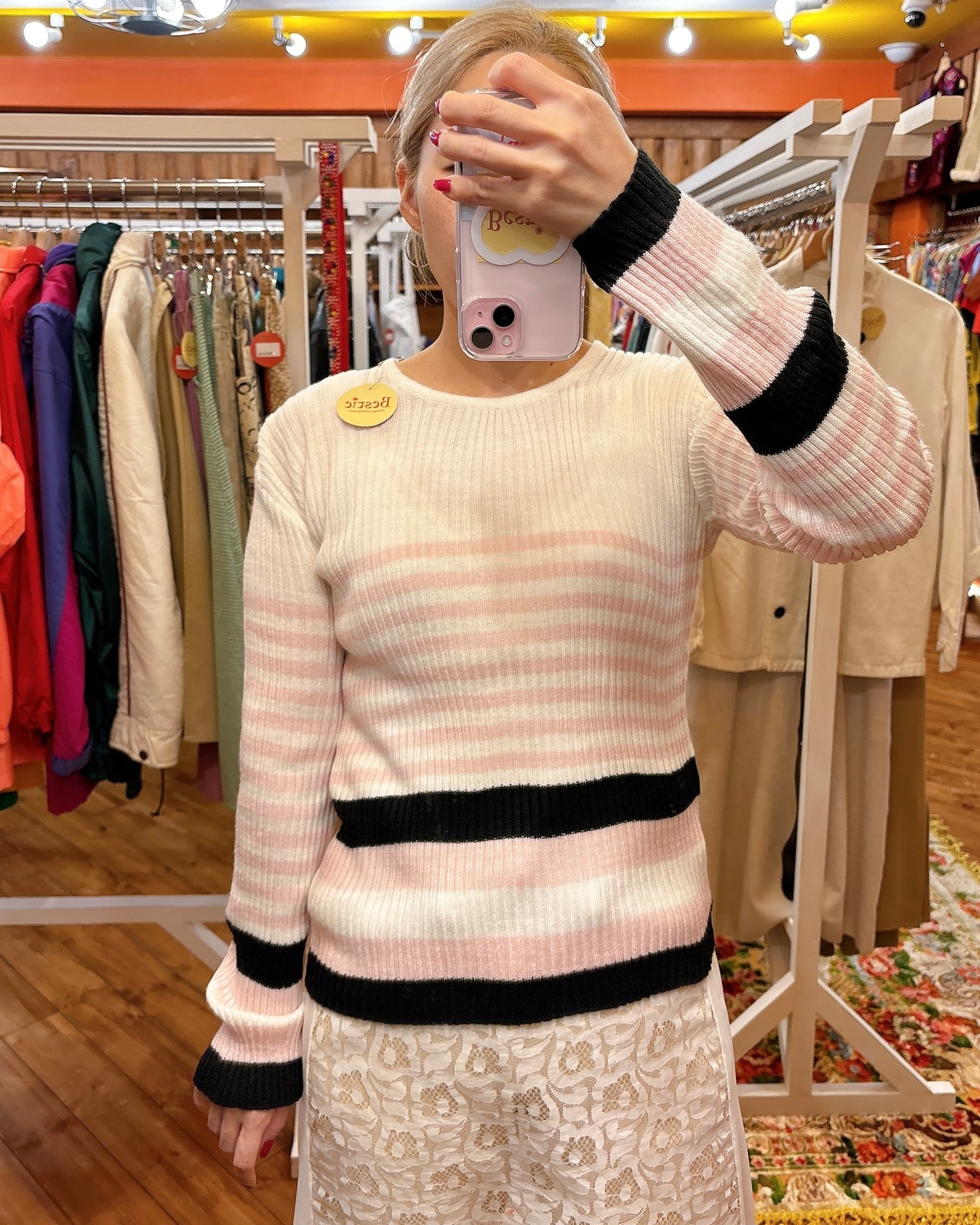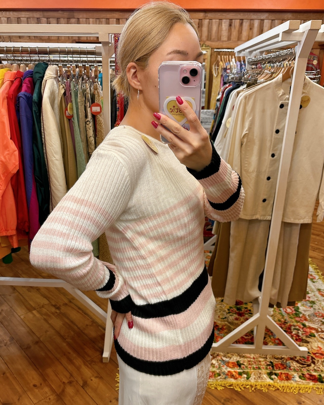白をベースに優しいピンクと黒のコントラストも女性らしくてかわいい!!おすすめです!