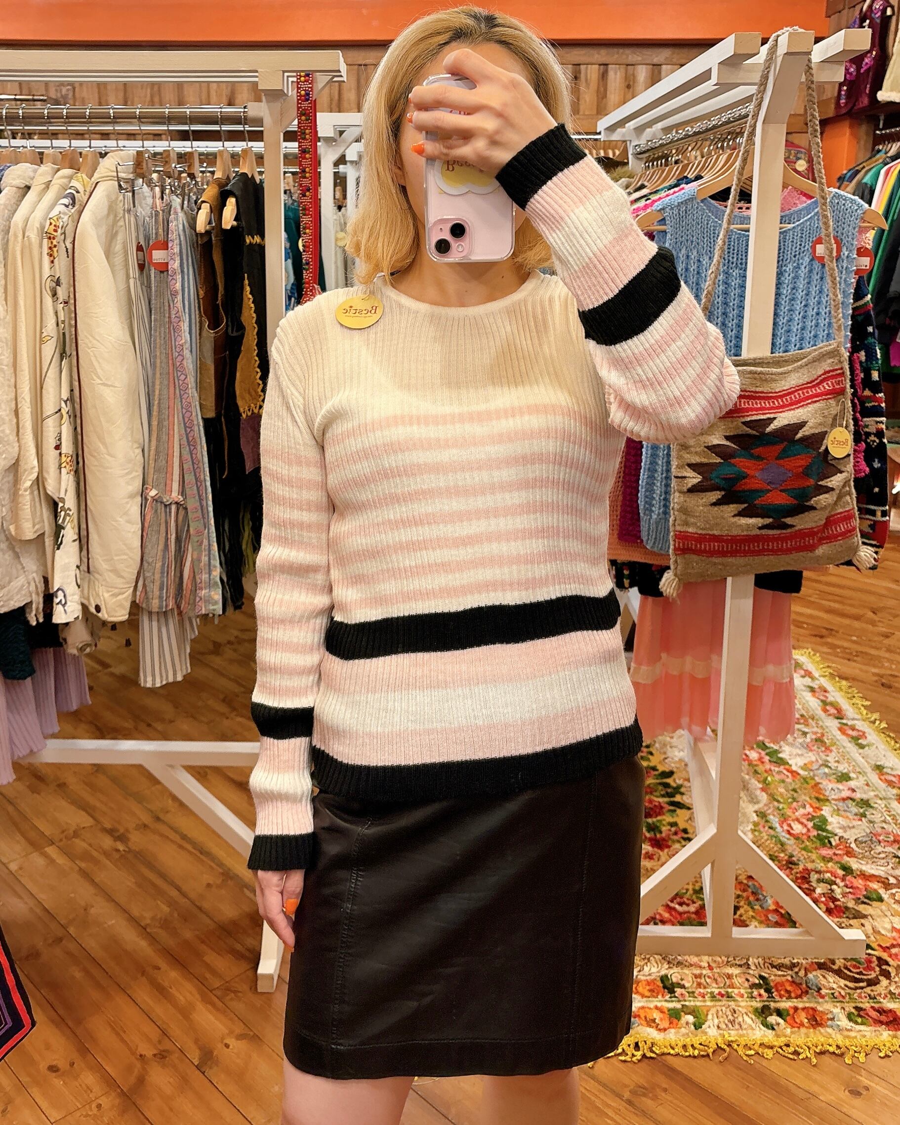 L/S マルチボーダー クルーネック リブニット プルオーバー トップス