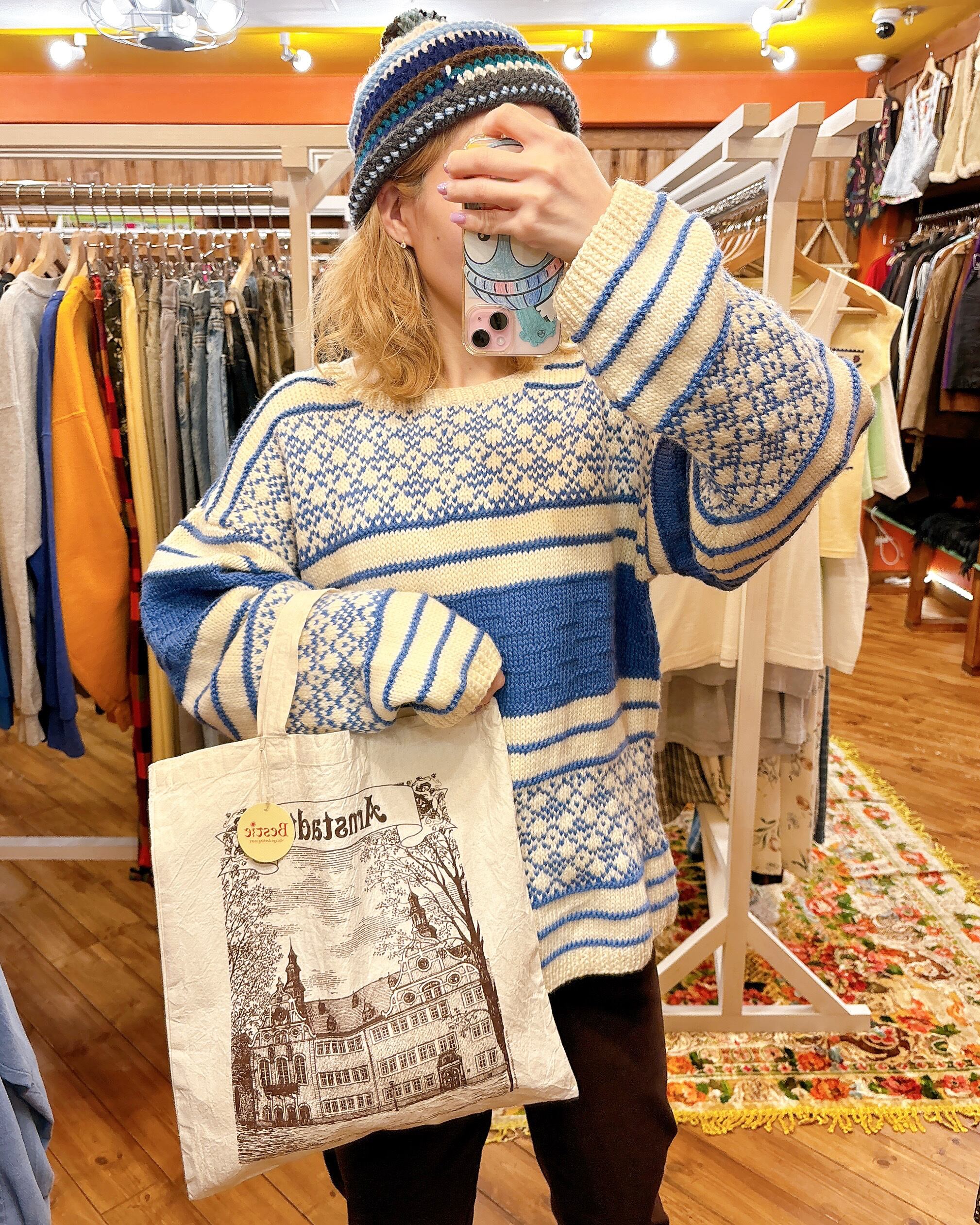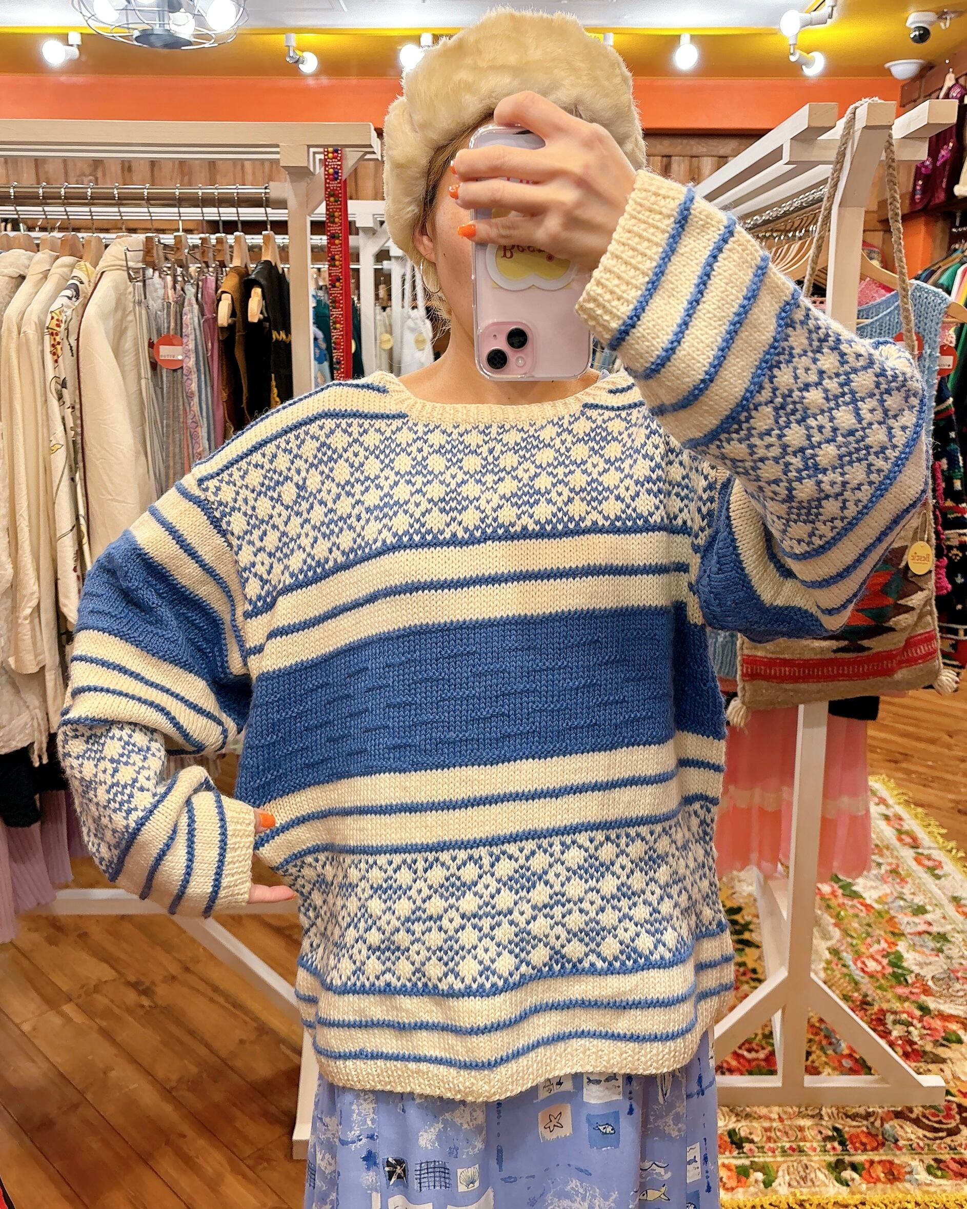 白をベースに青色のさまざまな柄編みが組み合わさったかわいい手編みセーターです!