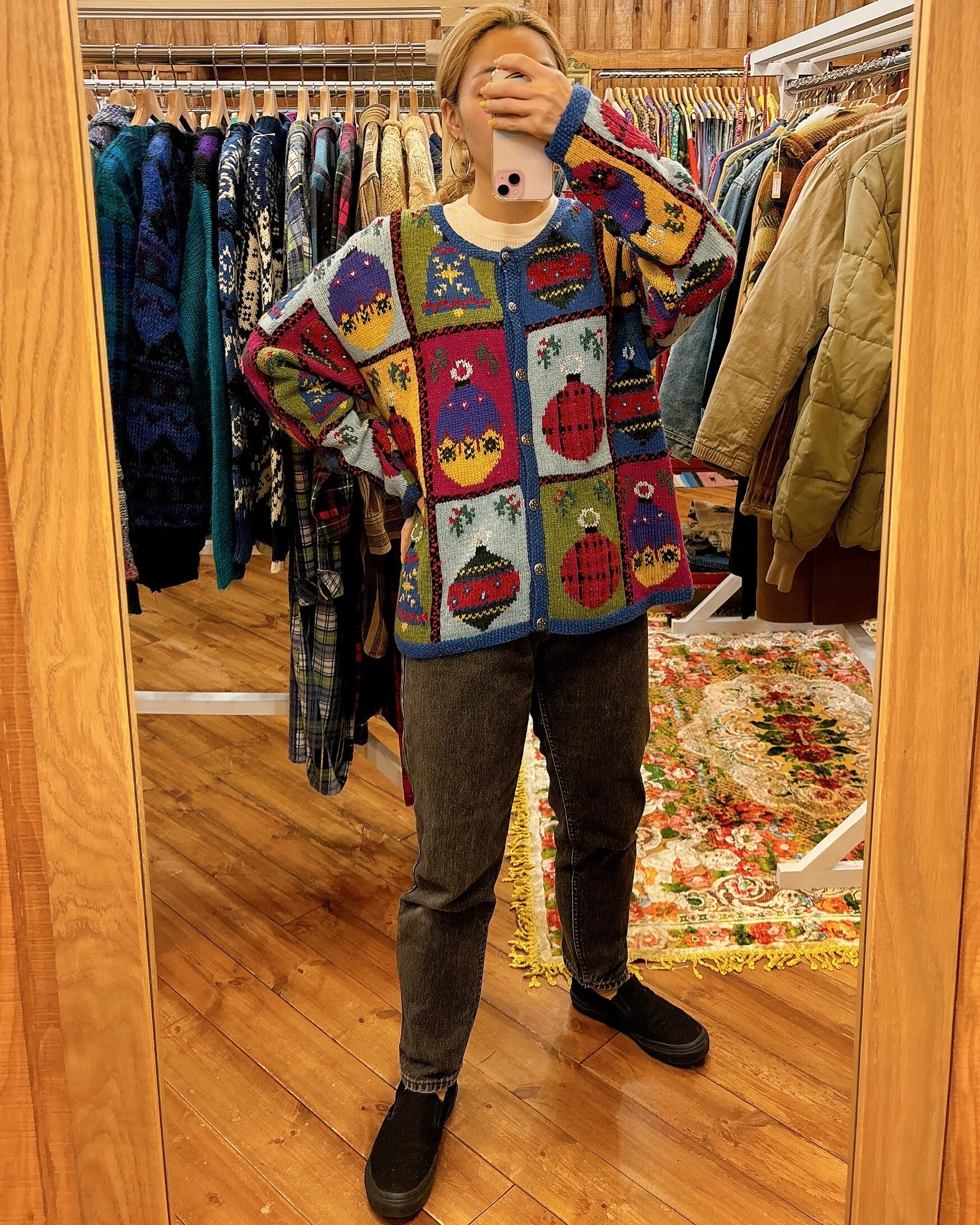 L/S 総柄 オーナメント柄 メタルボタン デザイン ニット カーディガン