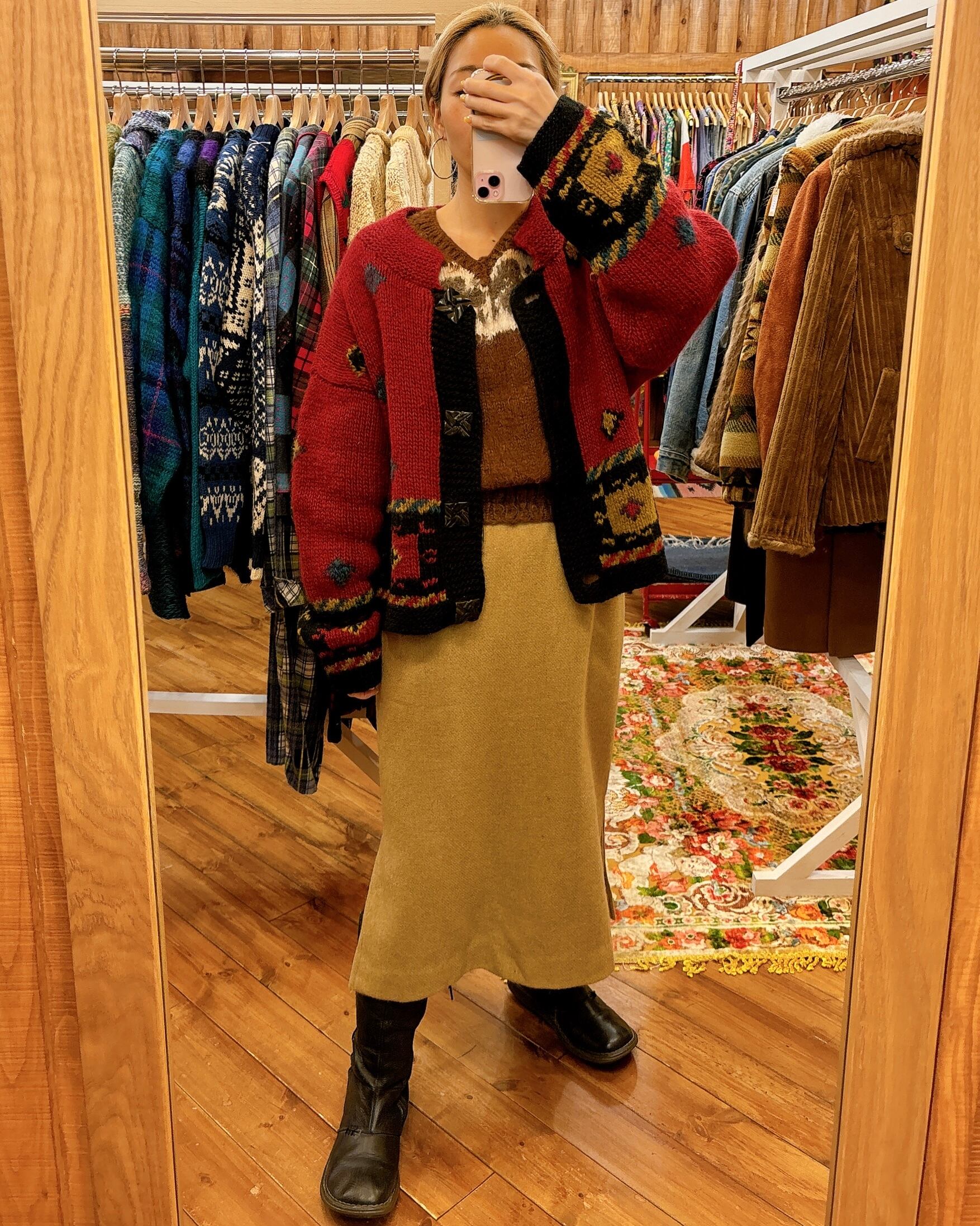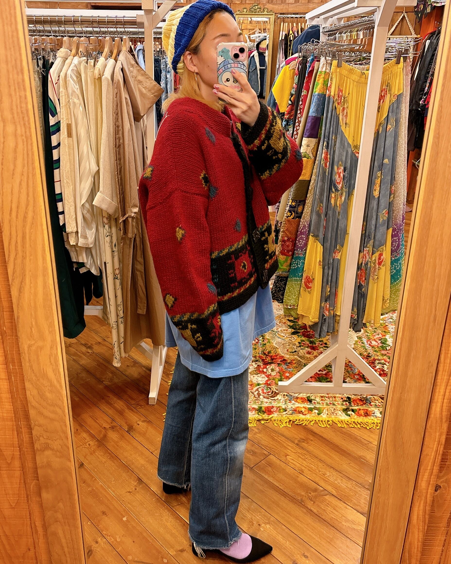 絶妙な立ち襟もすごくいい雰囲気です。毛糸は太めで生地もしっかりしていますが、柔らかく羽織やすいです。エクアドルニットもいいですが、個人的にはこの手のアジア系エスニックニットもおすすめです。