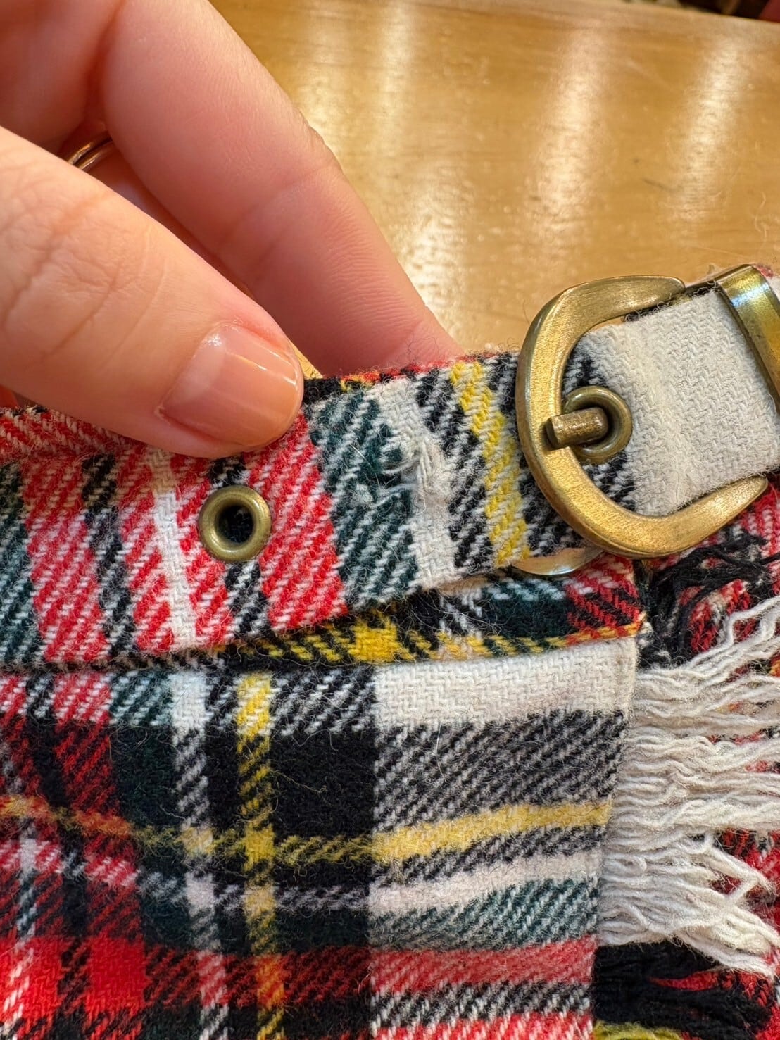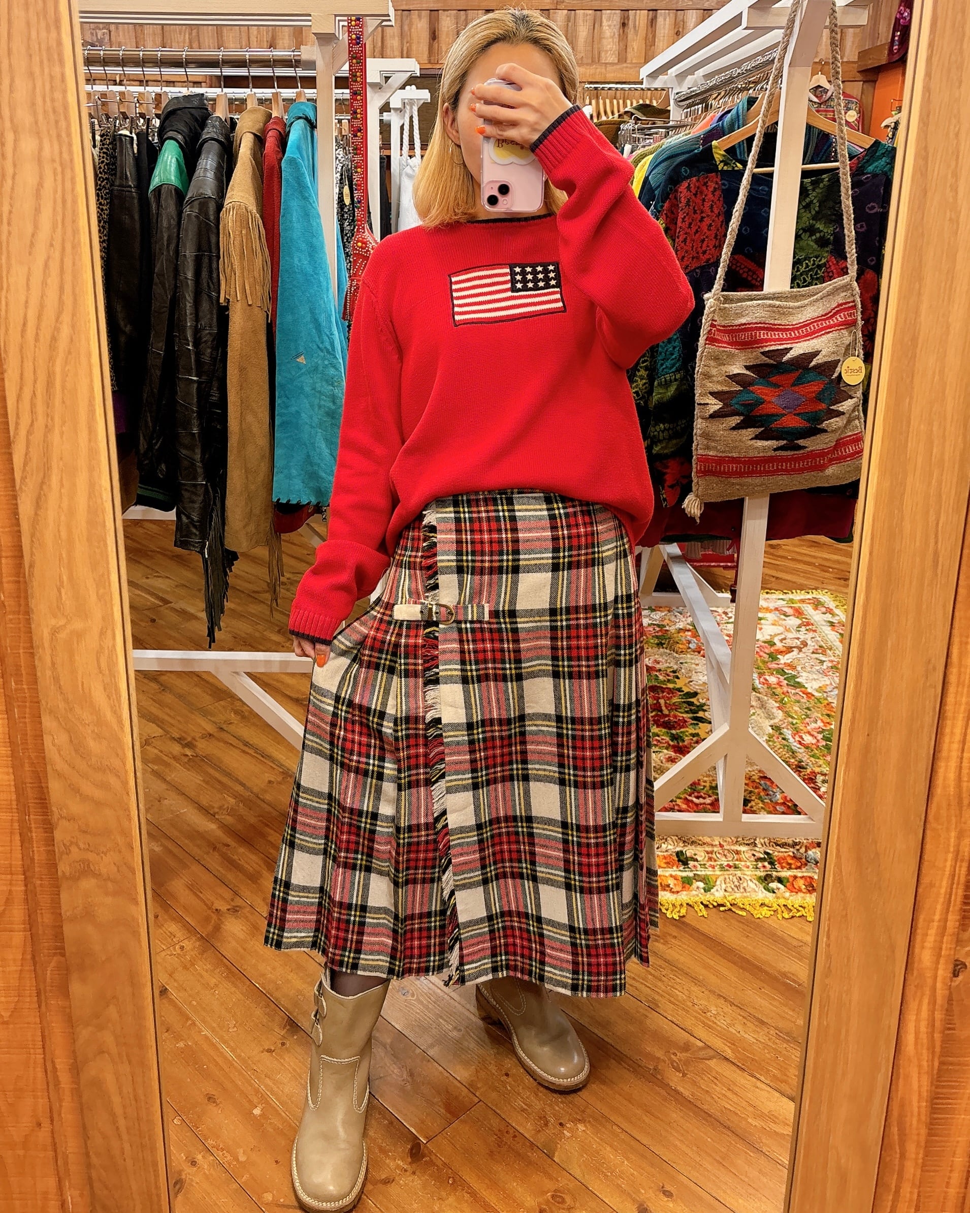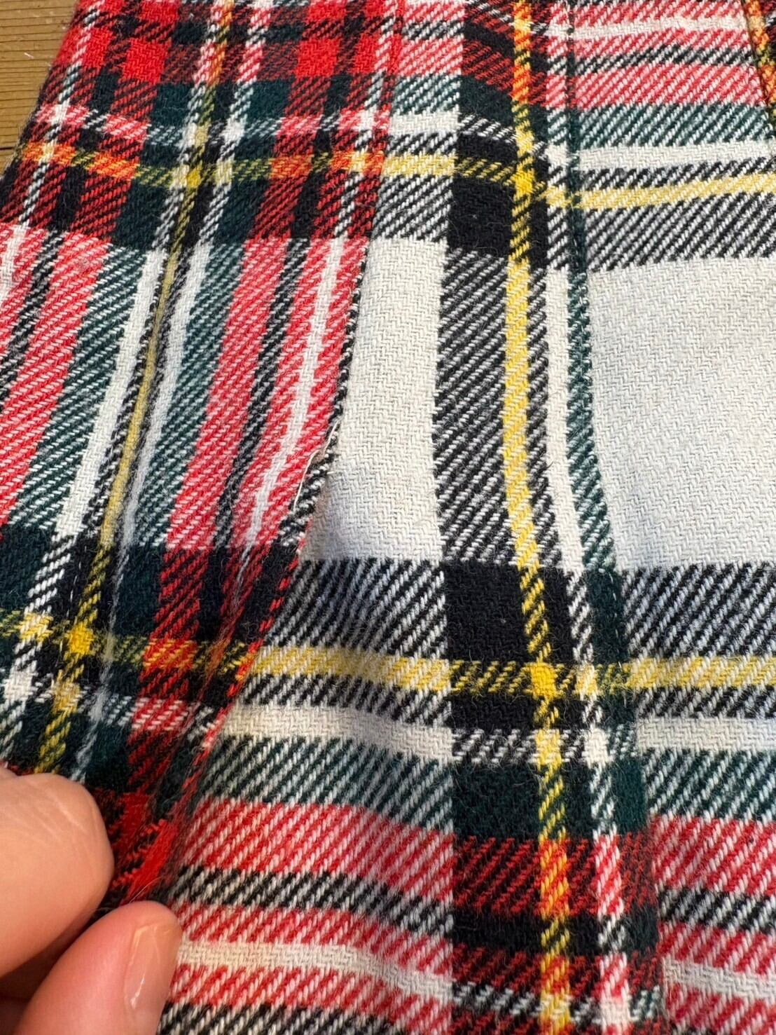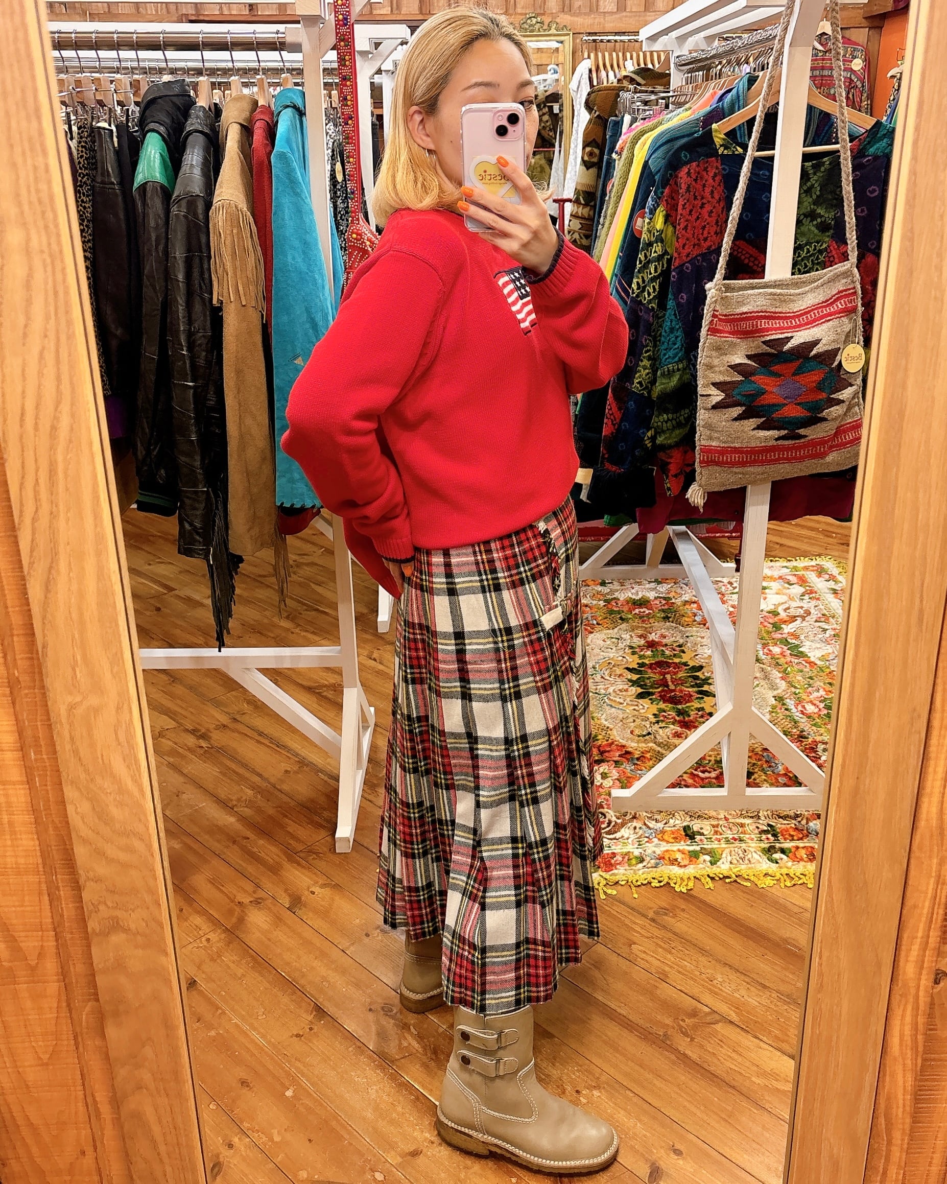 白ベースで赤グリーンのチェックがとてもかわいいプリーツスカートです。裏地、ポケットなし。