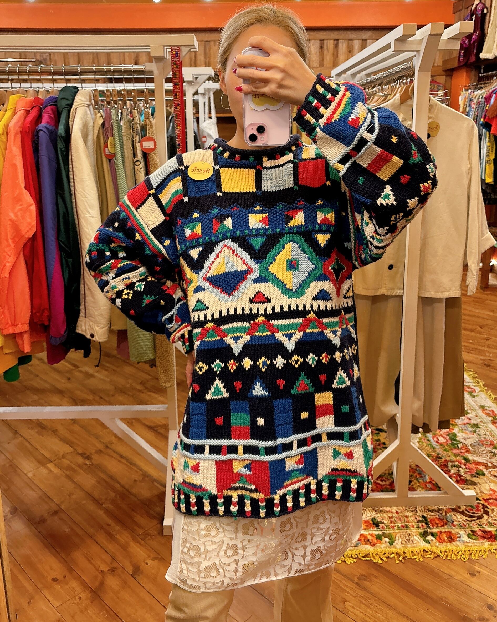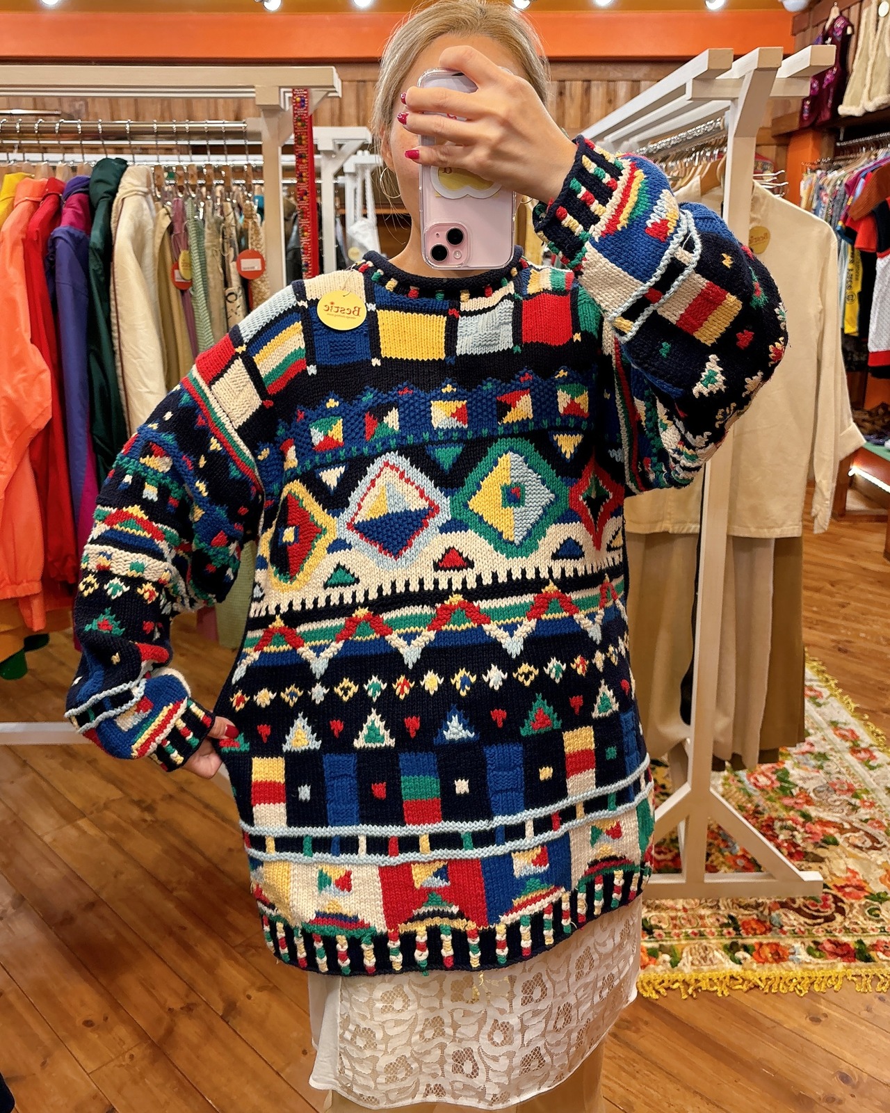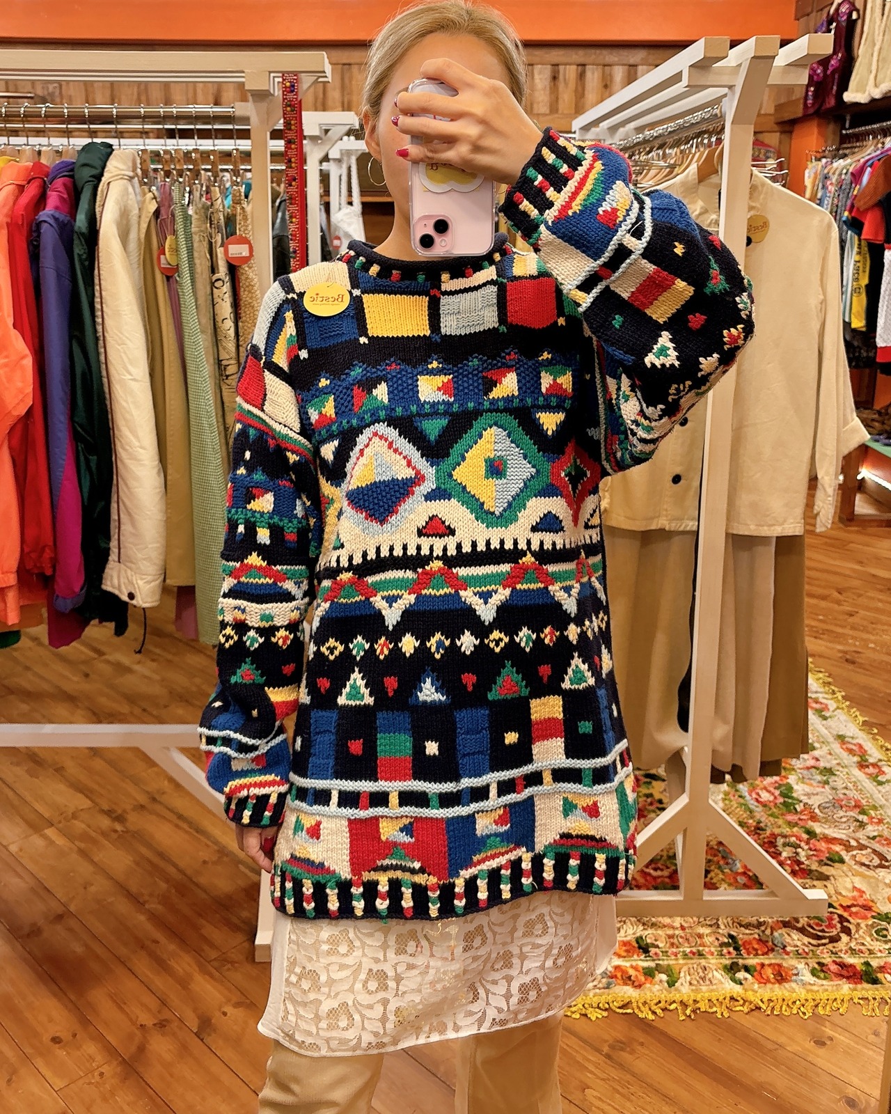 さまざまな色柄が一面にデザインされたすごくかわいいコットンニットのプルオーバーです。