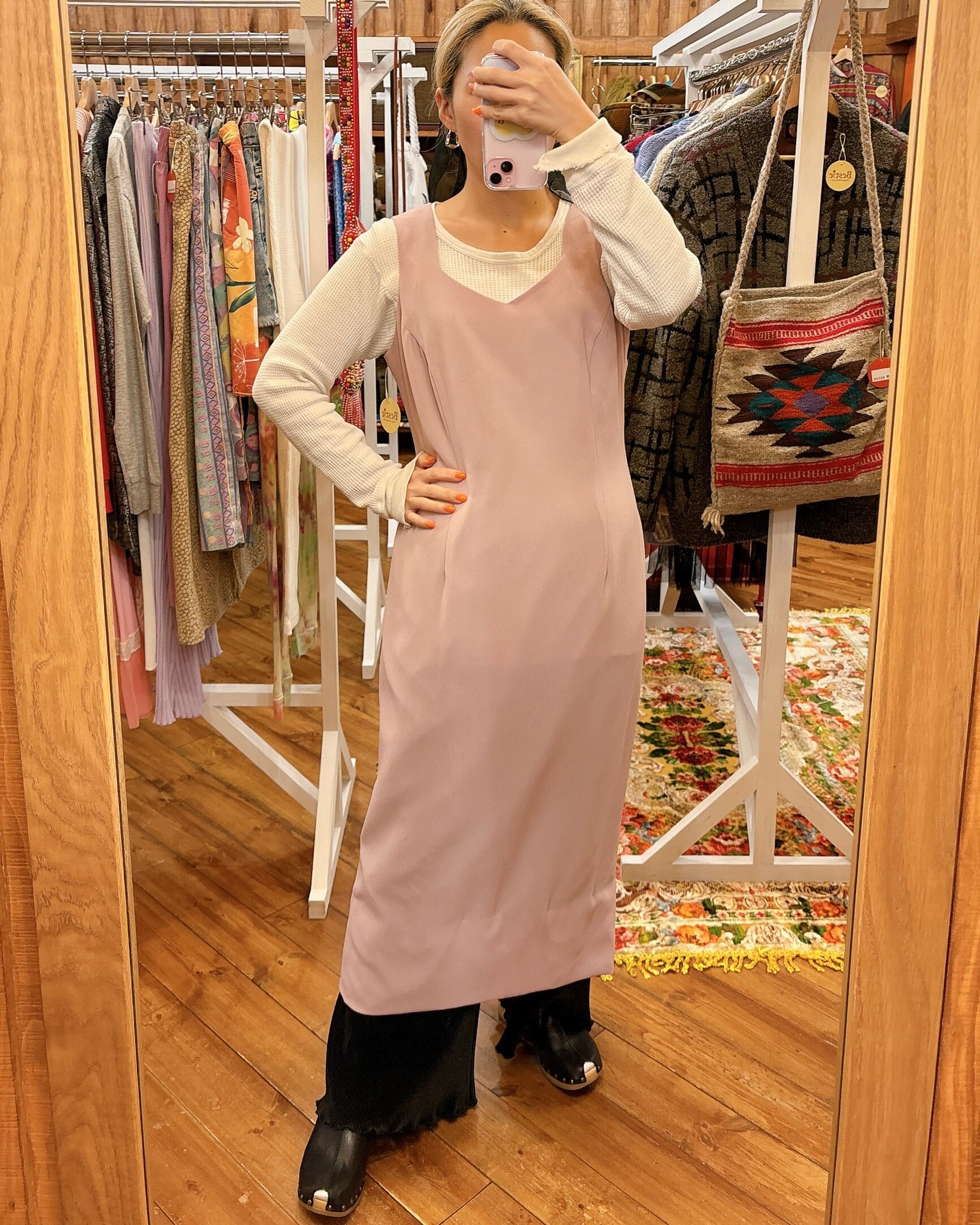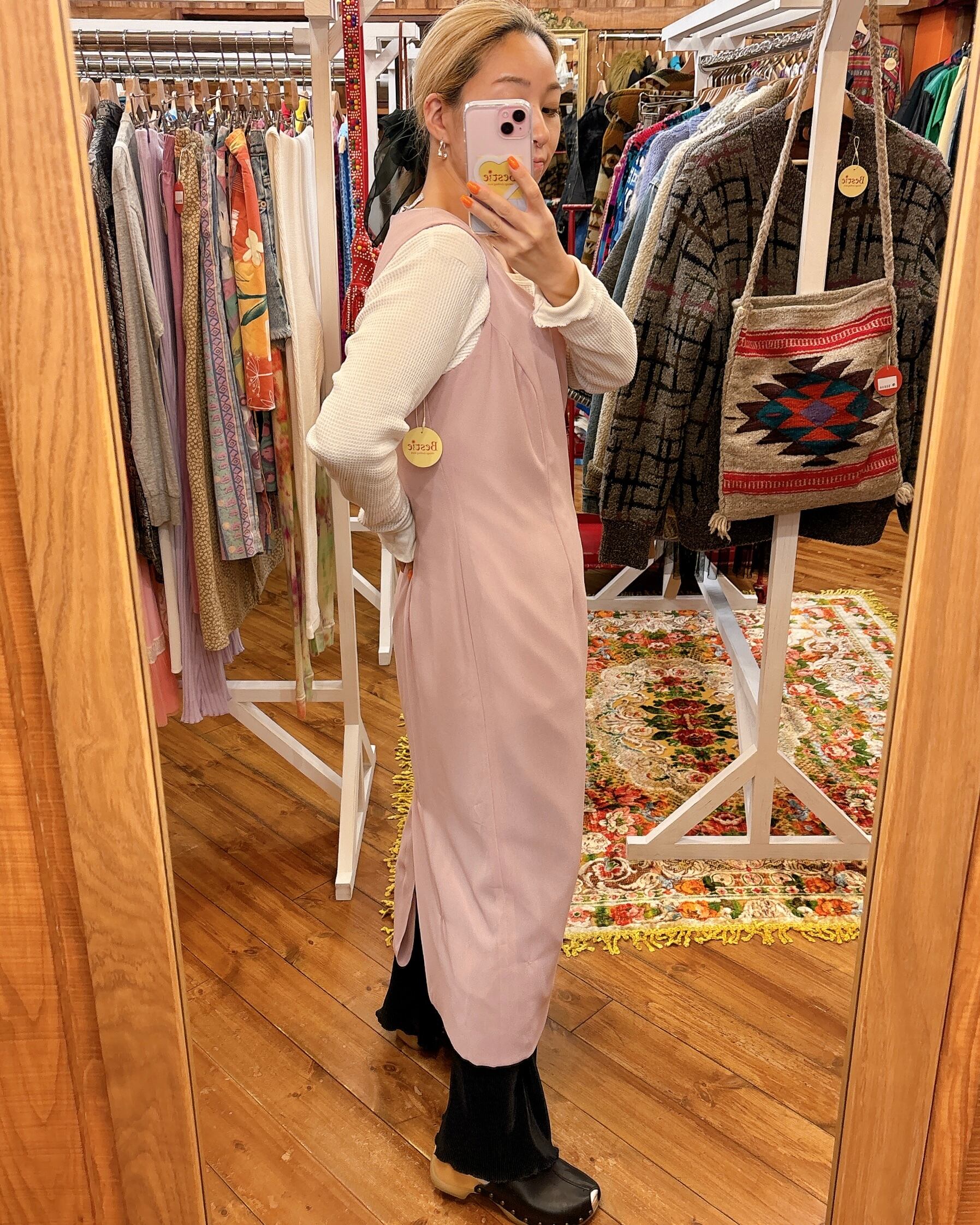 シンプルでややくすみがかったピンクがお肌馴染み良いカラーです!トップス部分や腰回りがふわっとゆとり出るデザインで着やすいです。生地はざらつきのあるポリのような素材です。裏地あり、ポケットなし。普段着とお仕事着とどちらにも使えそうです。
