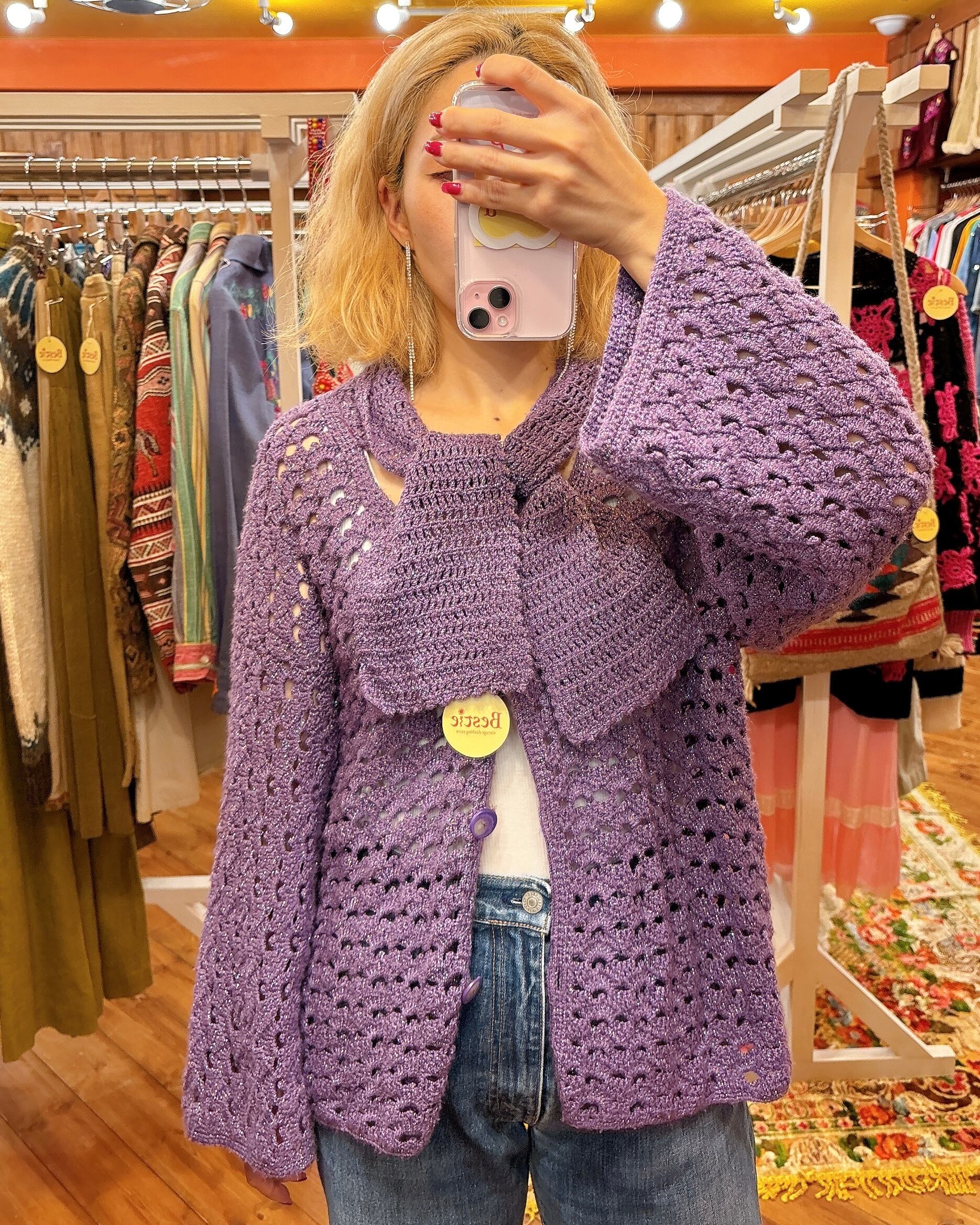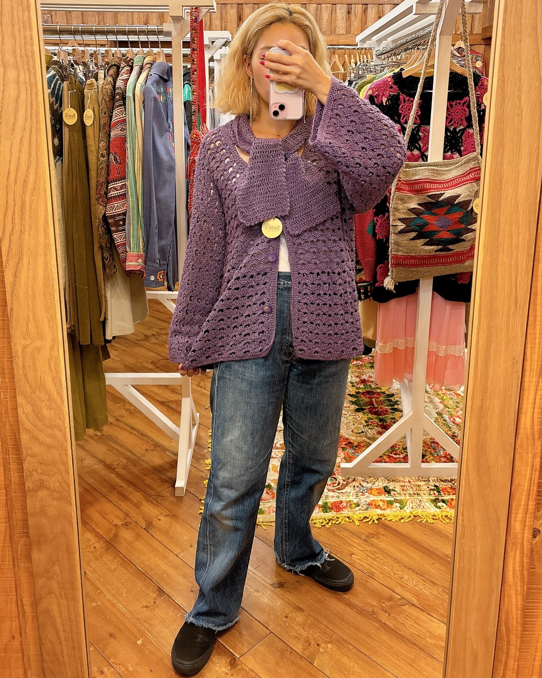 シルバーっぽいラメが混ざった毛糸のクロシェニットカーディガンです。USEDの手編みもので襟にスカーフのようなタイがついていてかわいいです。お好みで縛ってもそのまま垂らして着用してもかわいいですね。