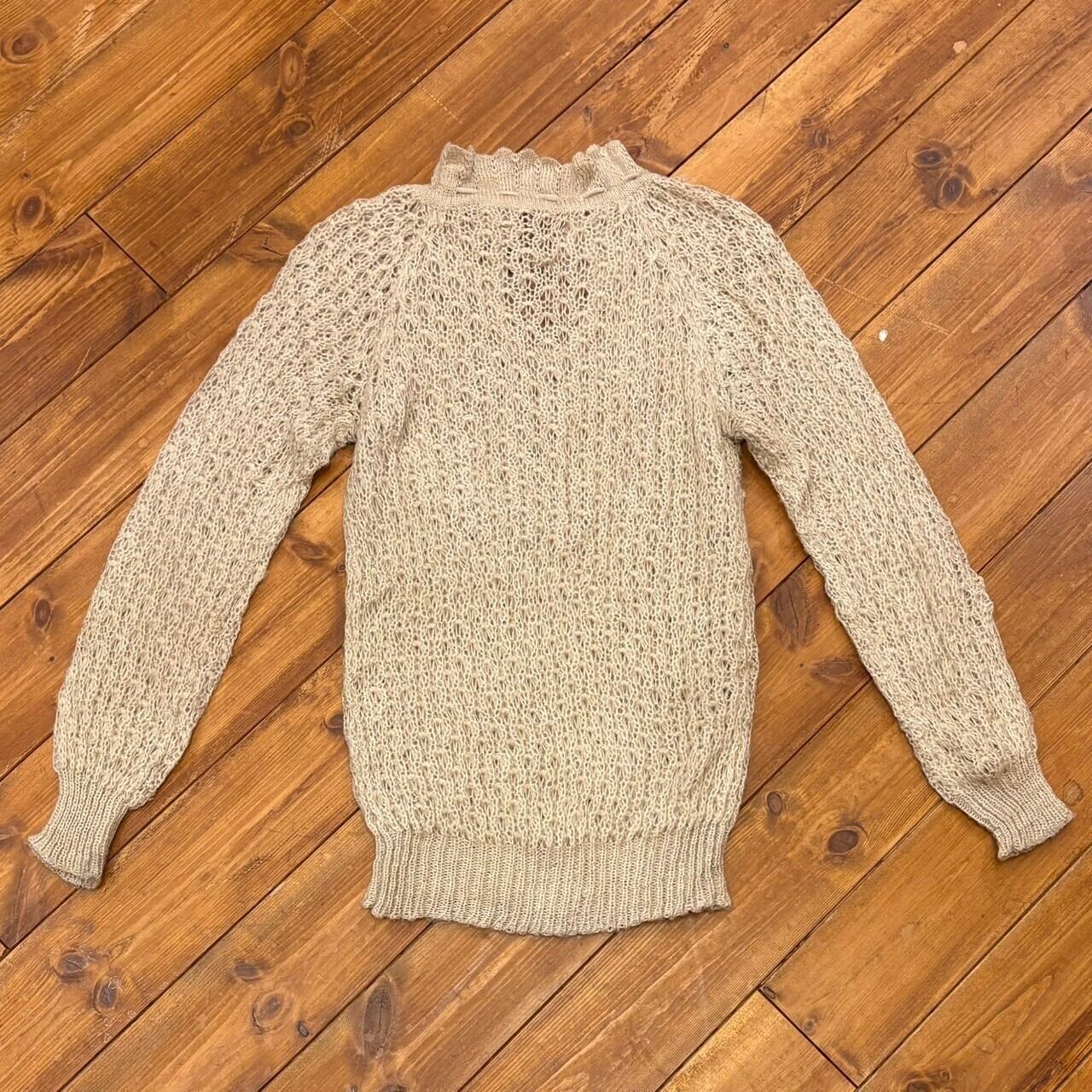 襟元のフリルと紐のデザインがかわいいニットのプルオーバートップスです。カラーも合わせやすいベージュでワンピースなどのインナーにも使いやすいです。