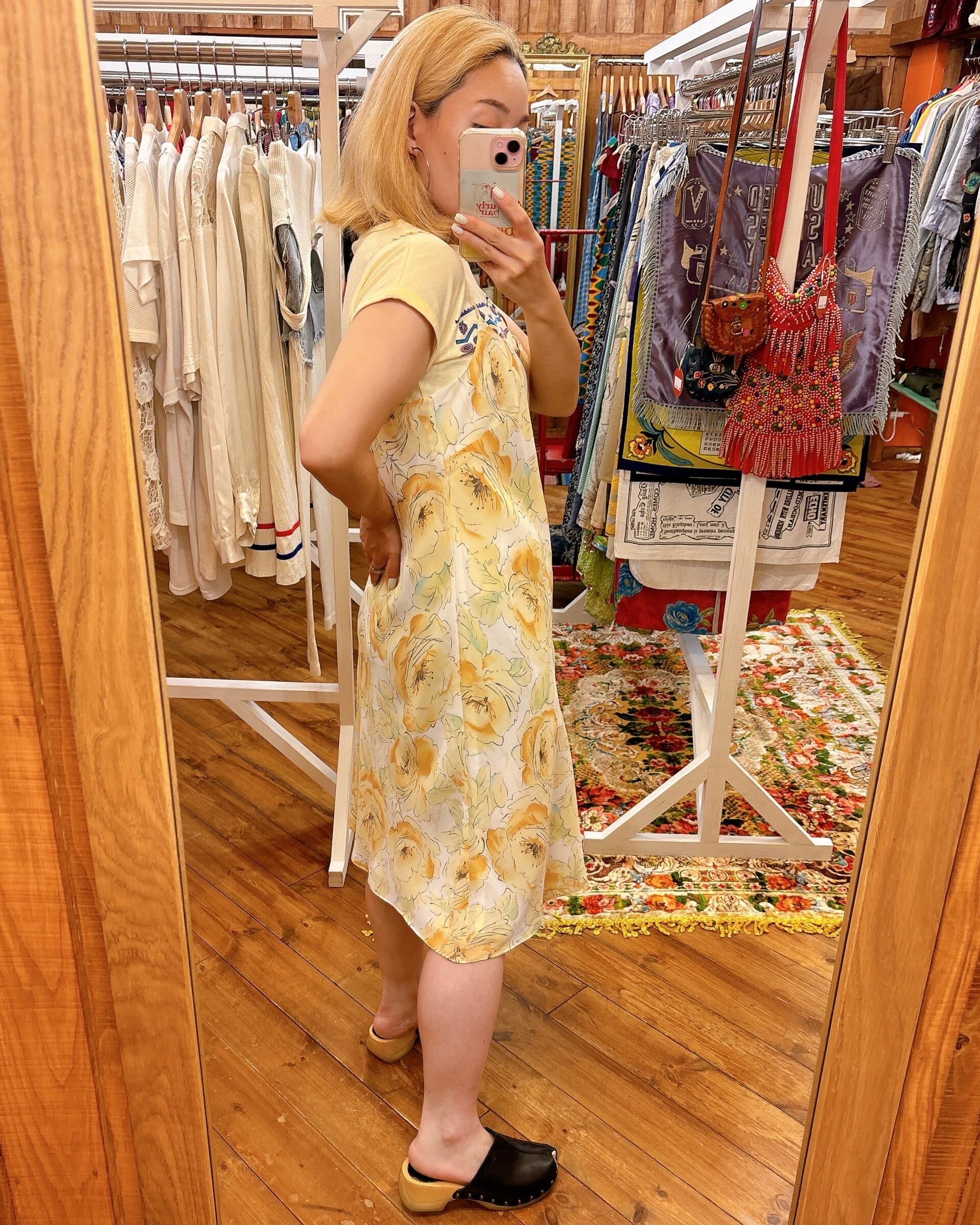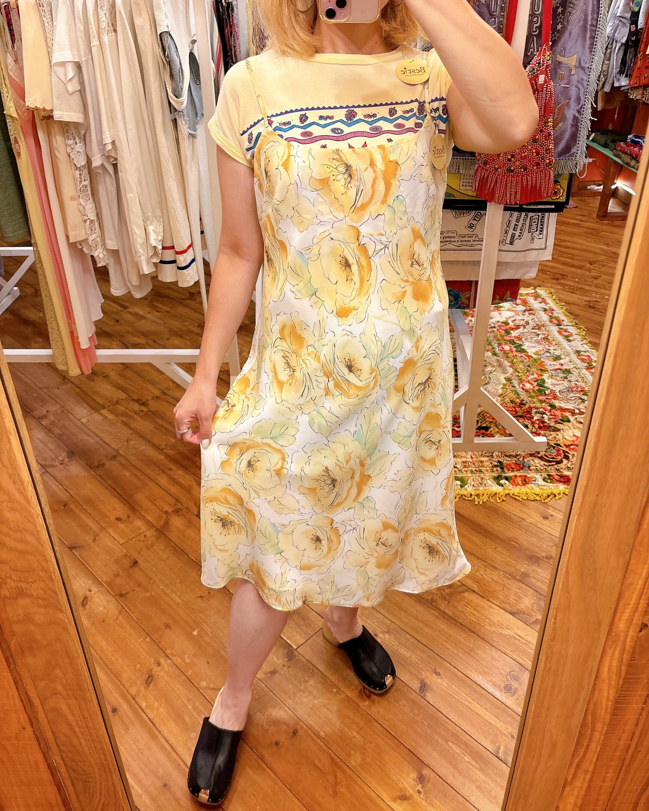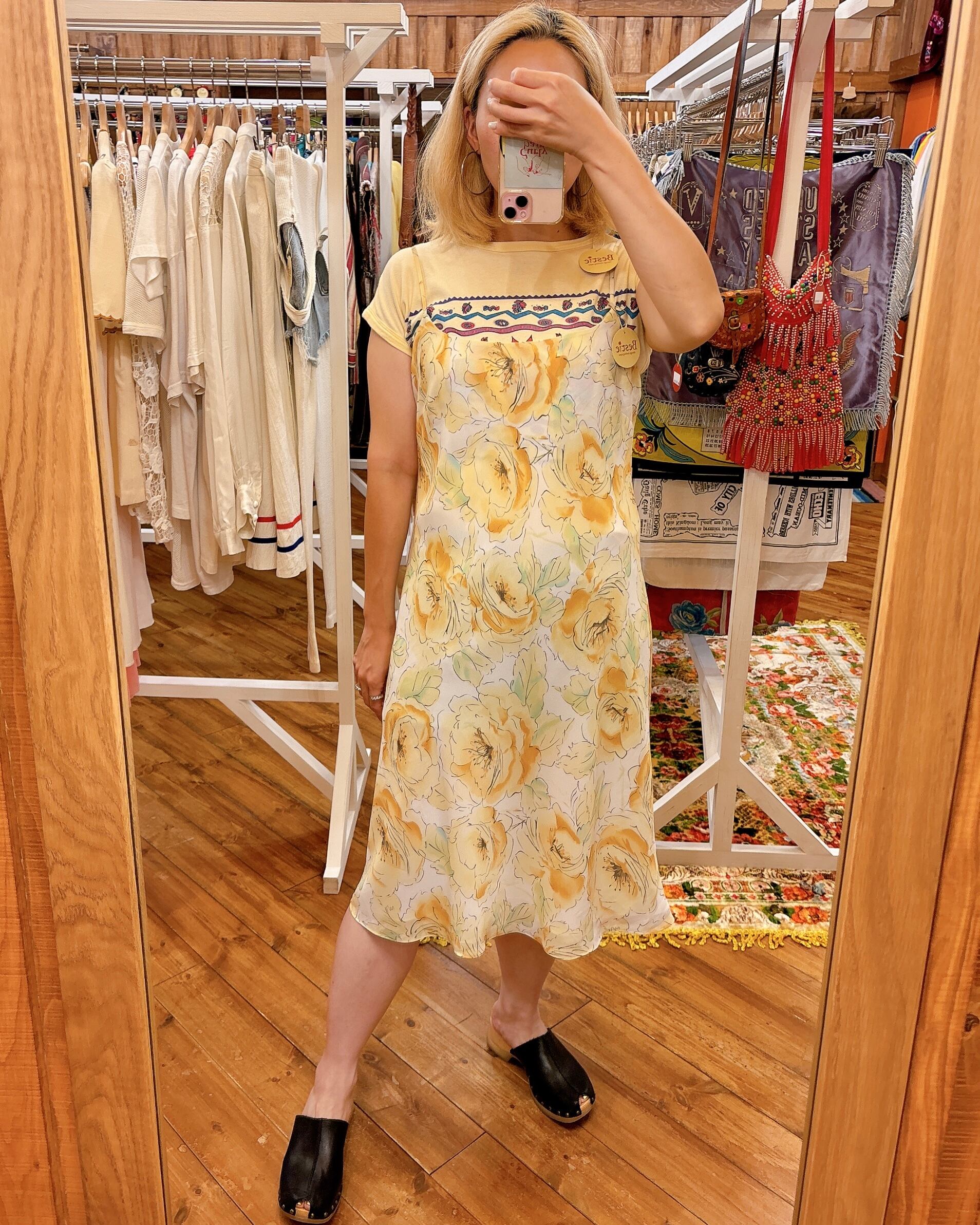 シンプルなデザインで軽やかな生地の揺れ動きがかわいいワンピースです。裏地がついていますが若干透け感あり。ジップなどはなくプルオーバーで脱ぎ着するタイプです。花柄の雰囲気も優しい印象で総柄ですが主張しすぎず馴染みよく着られそうです。
