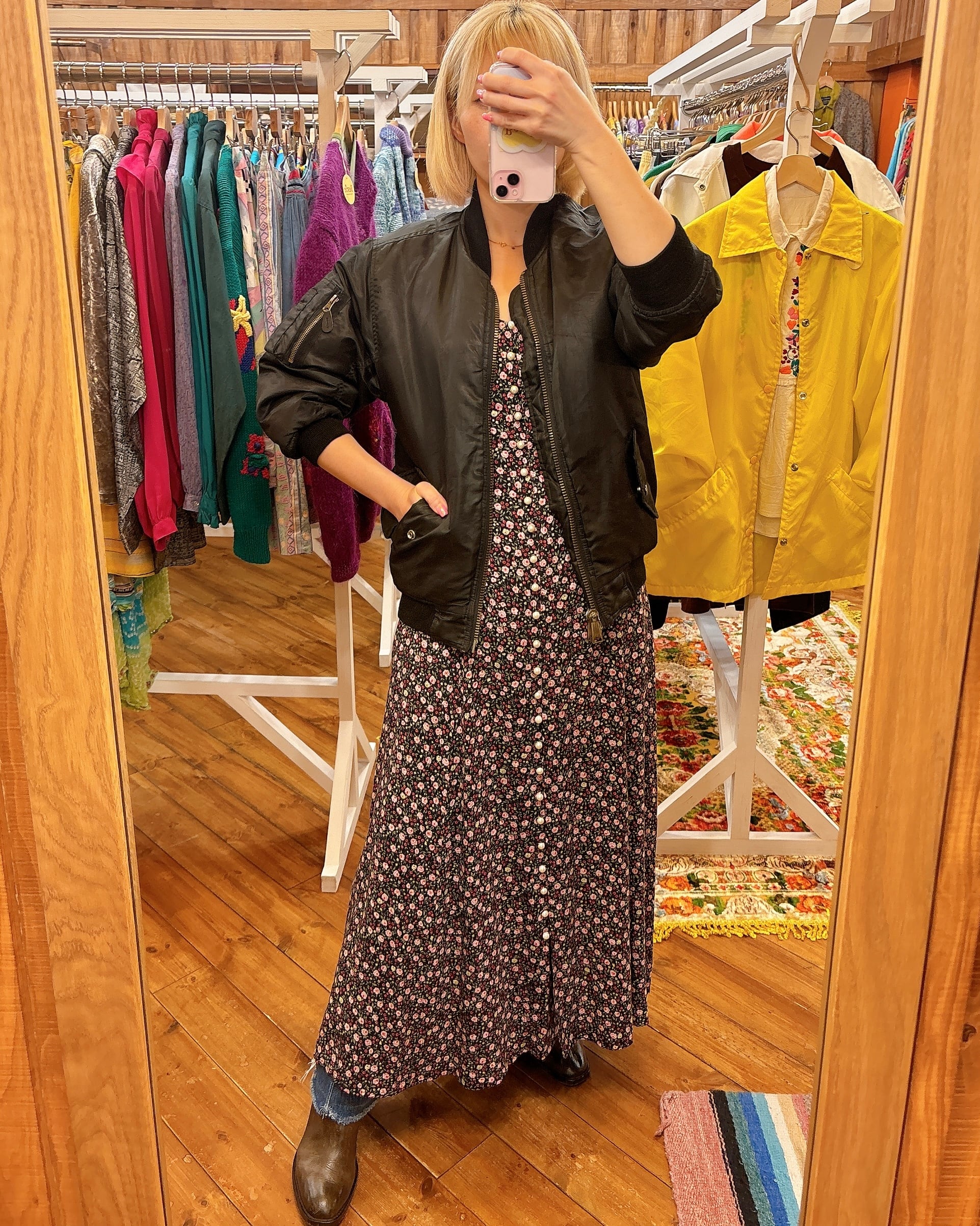 やっぱり黒ベースの小花柄はシルエットも引き立って最高にかわいいです。カラー的にも透けないので一枚で着れるしインナーの合わせでシーズンレスに使えます。フロントプルオープン、後ろレースアップでロング丈はお好きな方が多いと思います。