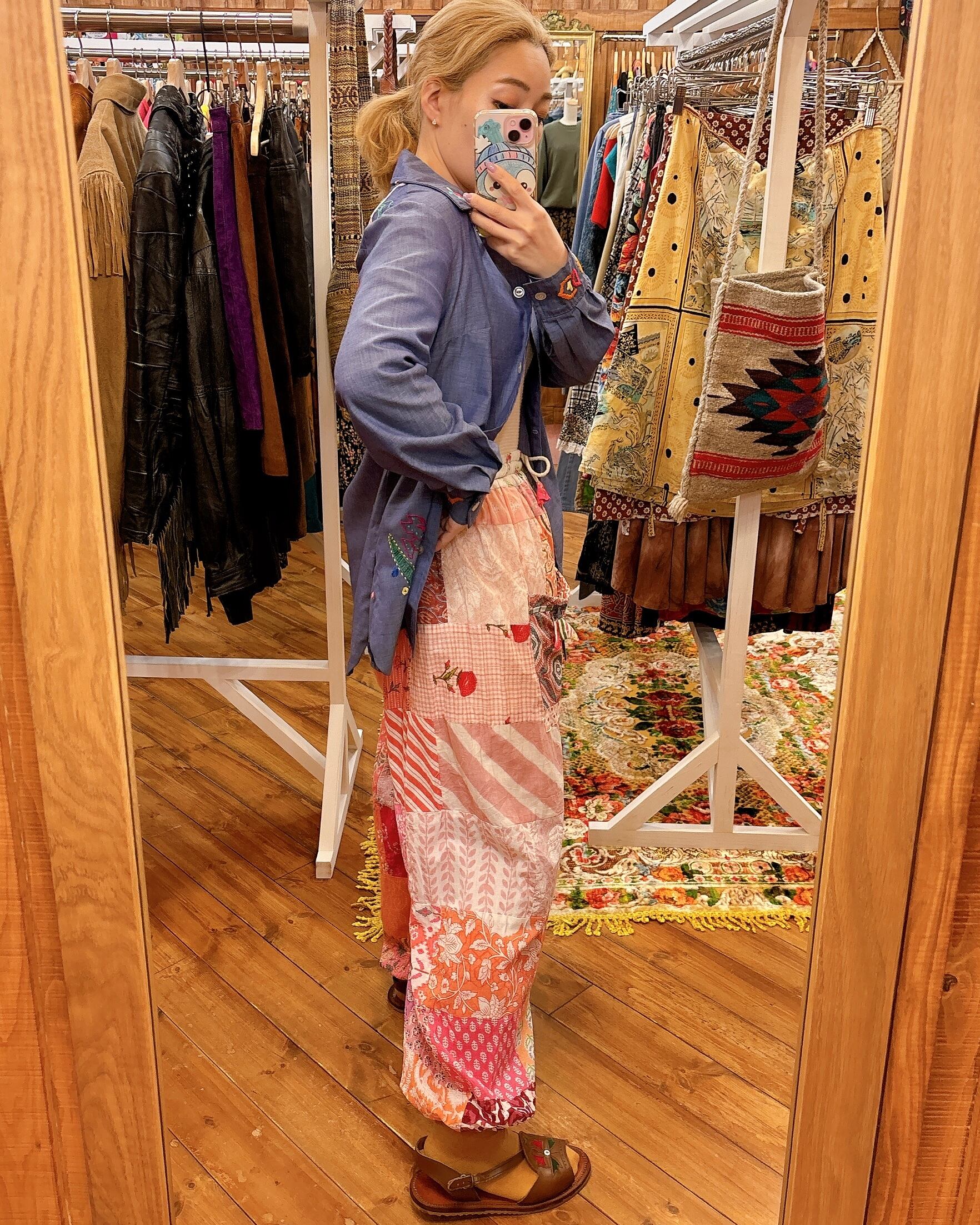 ふんわりした薄手生地のパッチワークイージーパンツです。ウエスト紐にタッセルのように生地がついていて、それもまたかわいいです。
