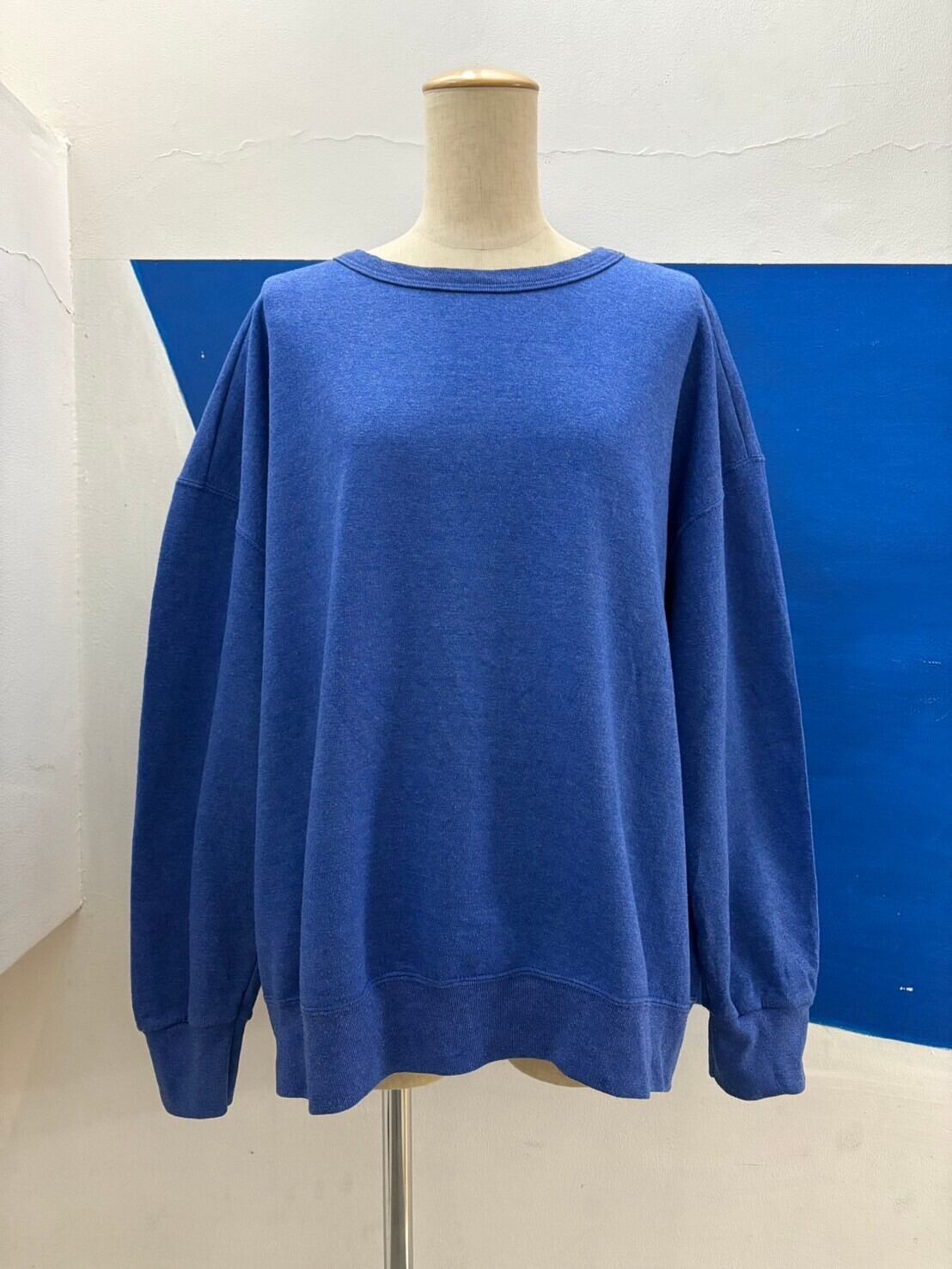 パキッとした原色の青ではなくて、霜降りのようにうっすら白をミックスしたような少し個性ある青がかわいいスウェットシャツです。ベーシックなクルーネックでサイズも大きいので男女問わず着られます。