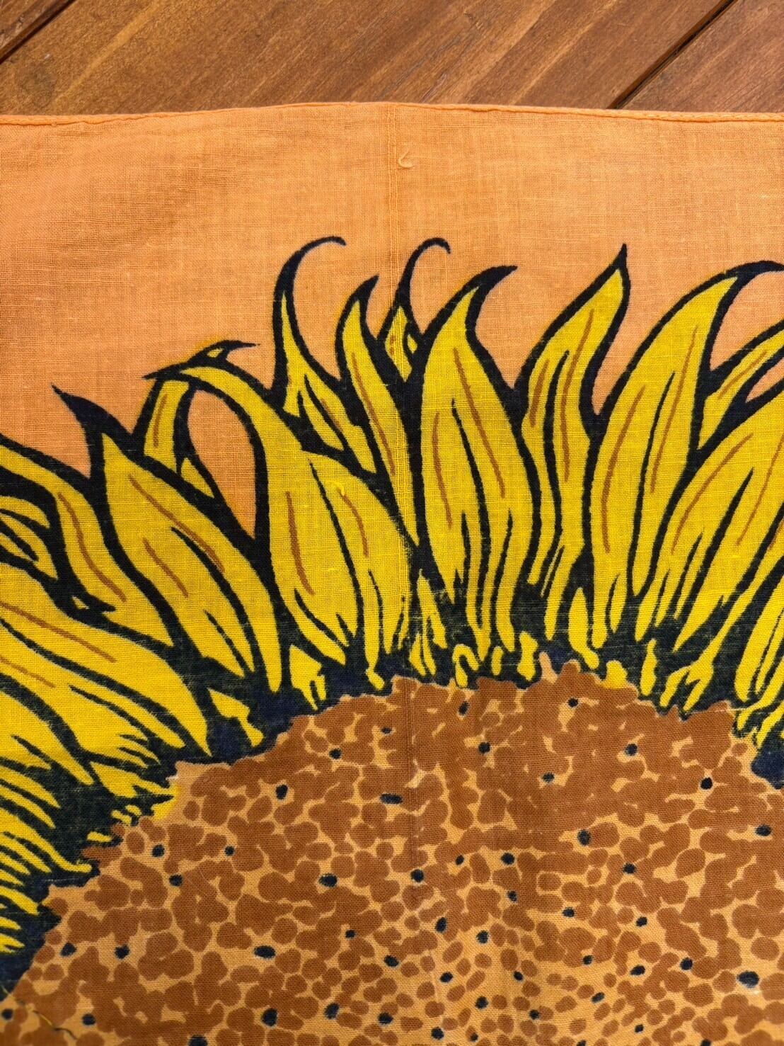 大きなひまわりがプリントされたかわいいバンダナです。普段使いにもコレクションにも押さえておきたいプリントです。