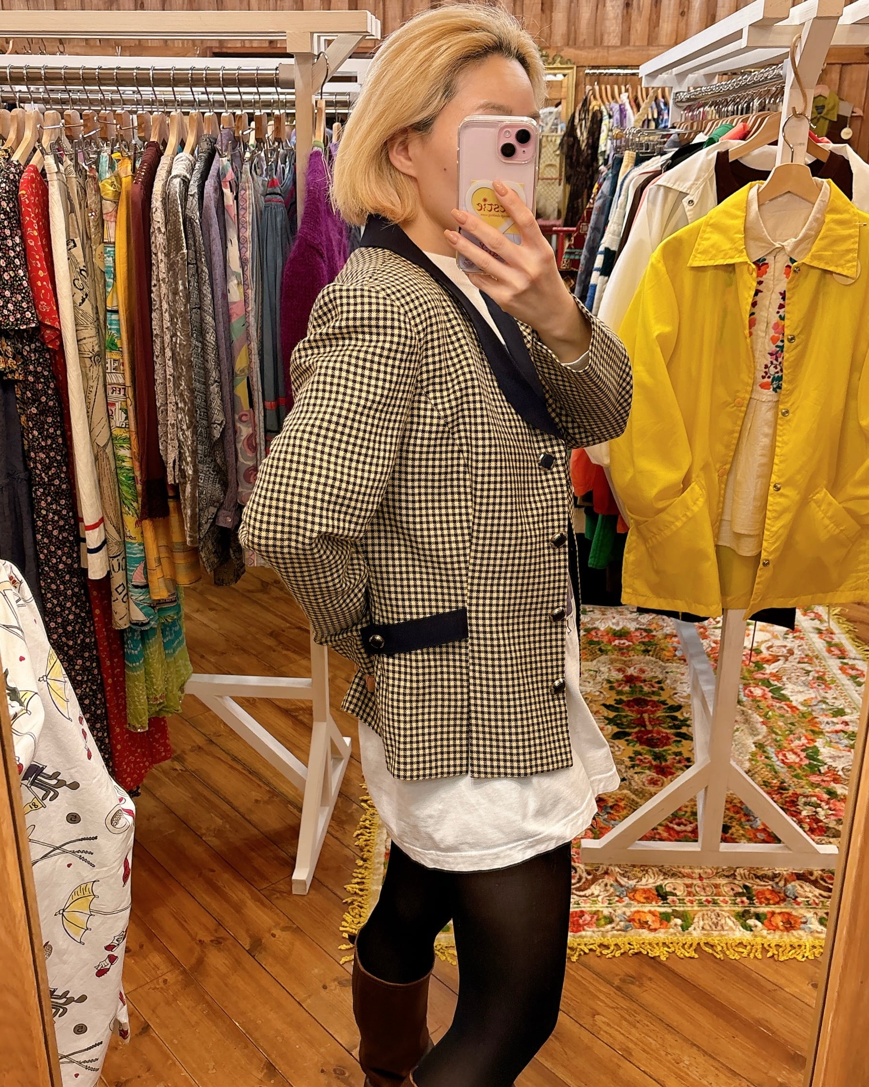 裏地なし、軽いレーヨン素材のチェック柄ジャケットです。プラとメタル素材のボタンもかわいくてウエストマークされたシルエットも素敵です!